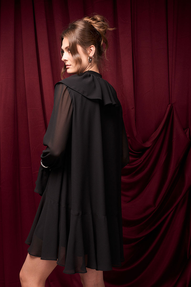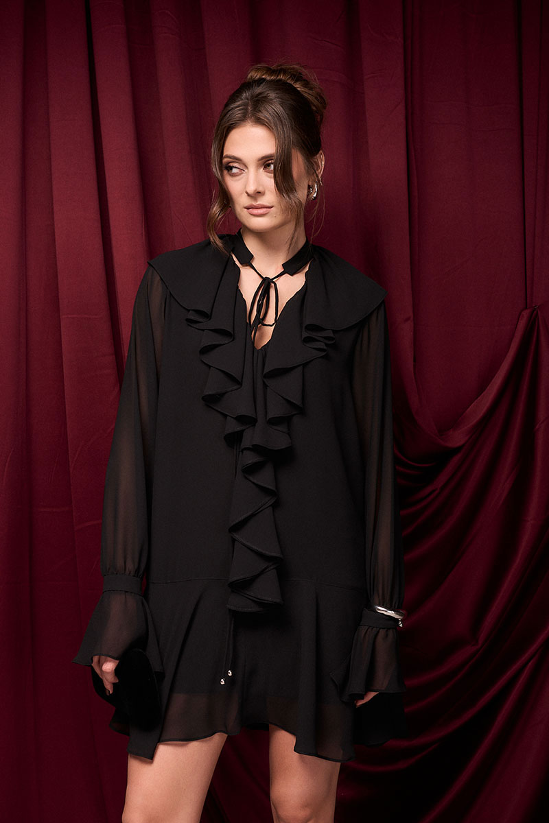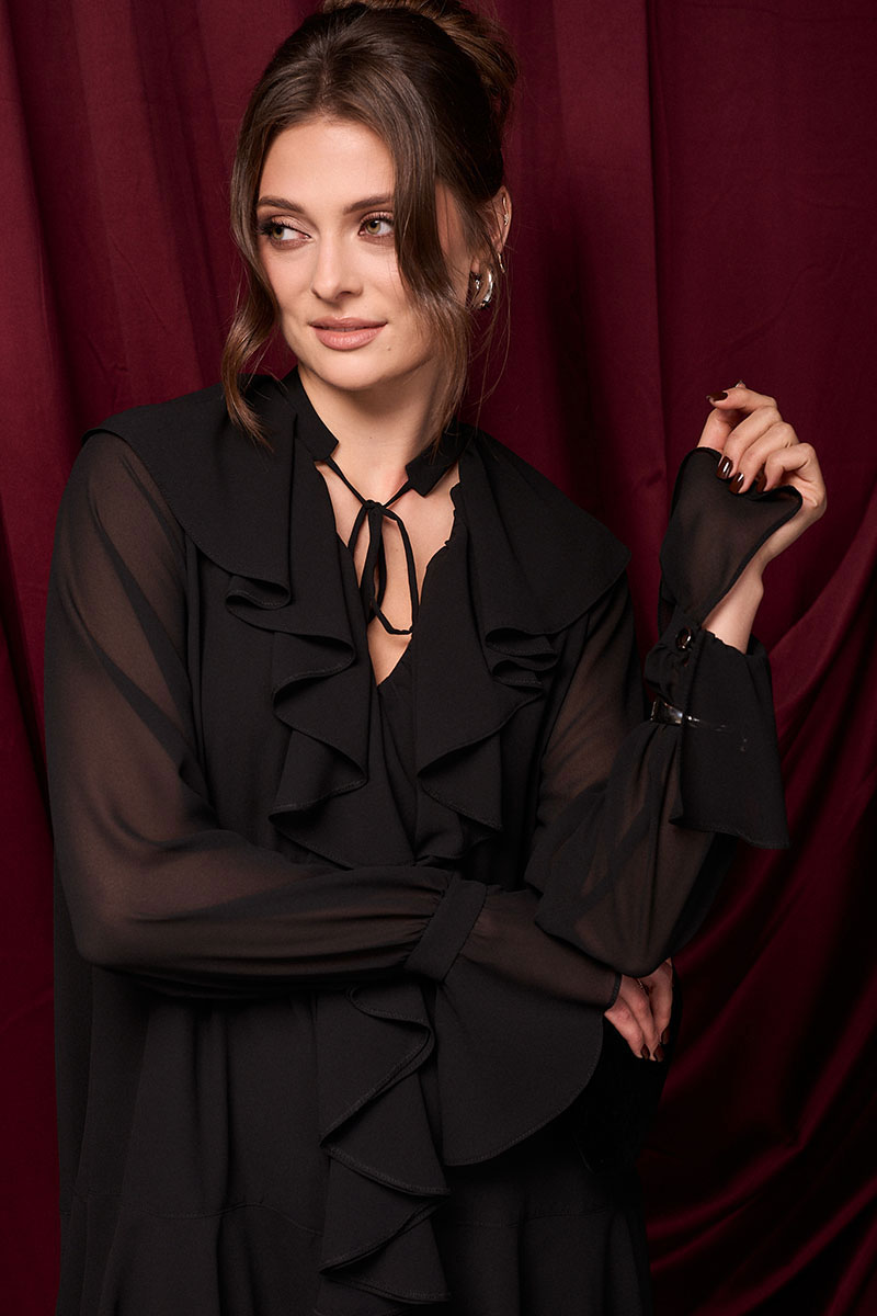 Платье из летящей струящейся ткани. Платье свободного силуэта, декорировано рюшами. Платье на подкладке.