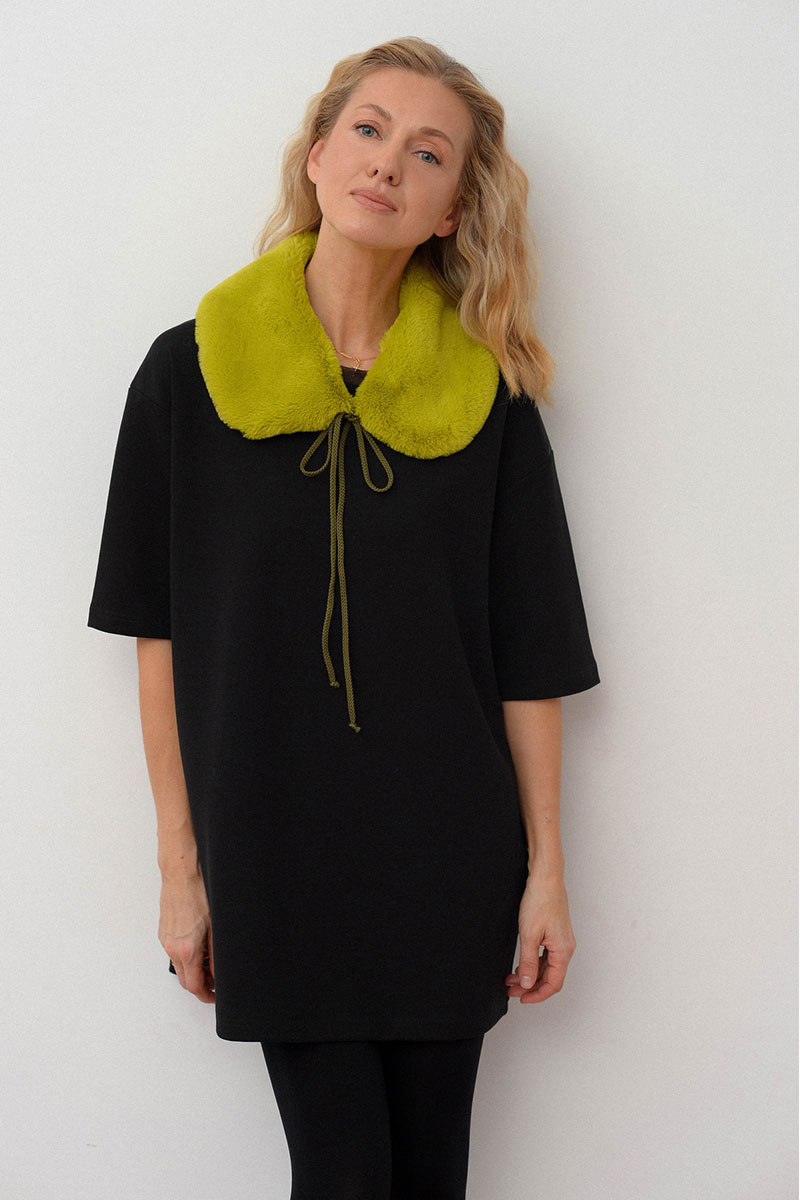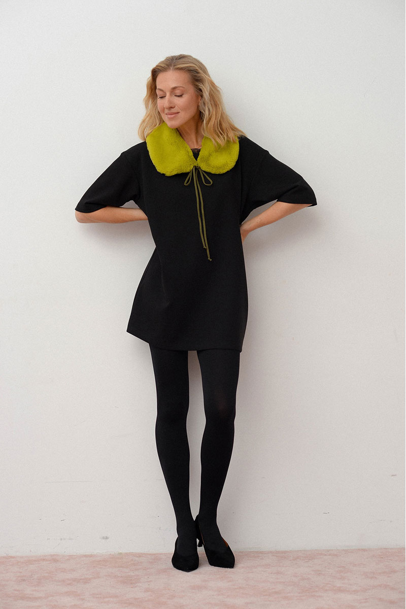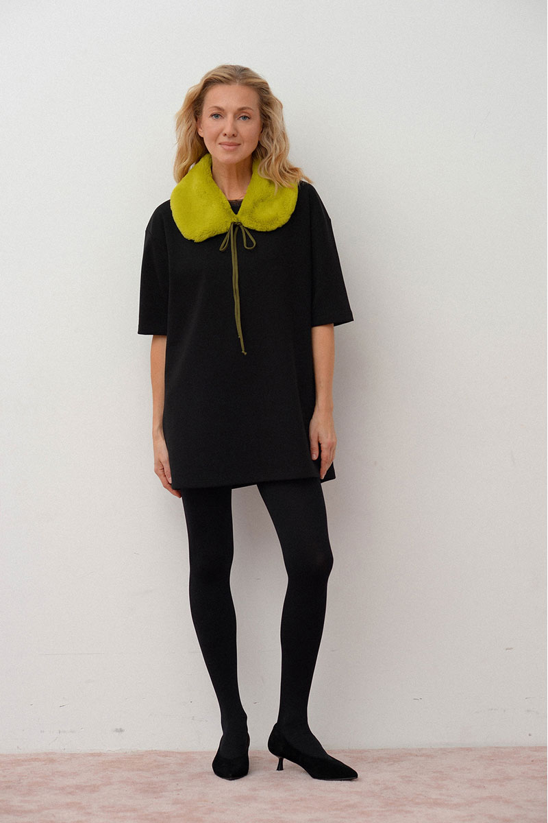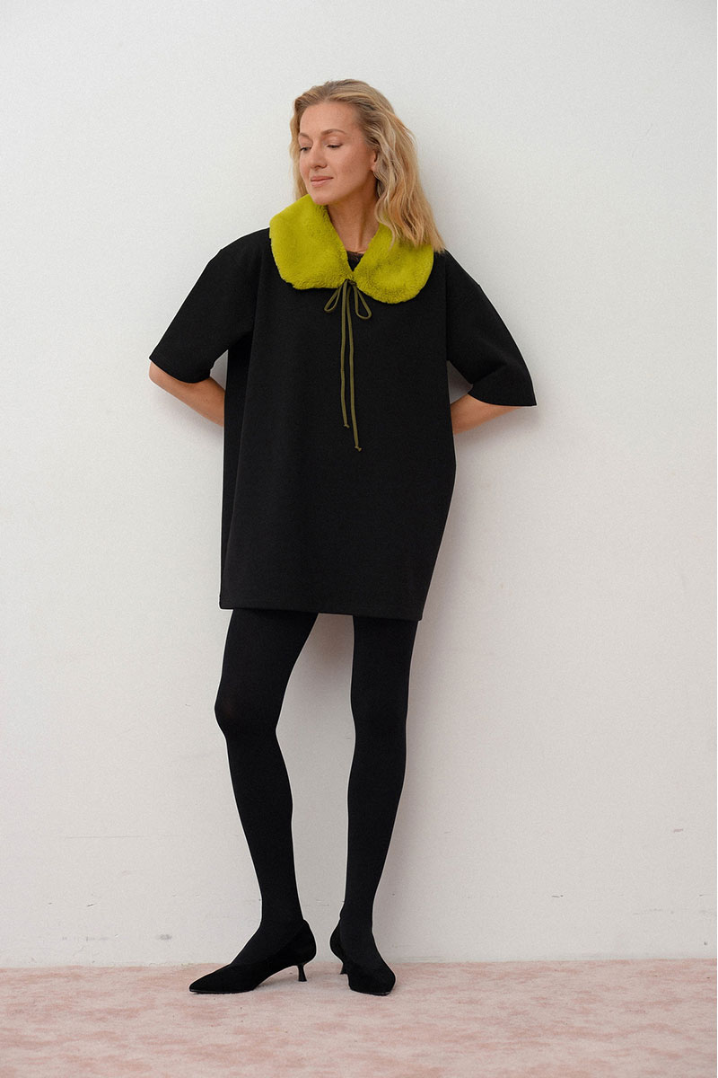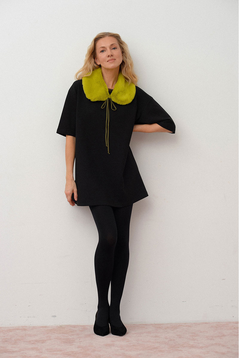 Платье мини со съемным воротником. Лаконичное, но запоминающееся благодаря съемному воротнику в зеленом оттенке из итальянского экомеха. Идеально в случаях, когда образ должен быть комфортным и изящным одновременно. Выполнено из плотной приятной к коже хлопковой ткани. Горловина обработана нежной сеткой в тон платья.