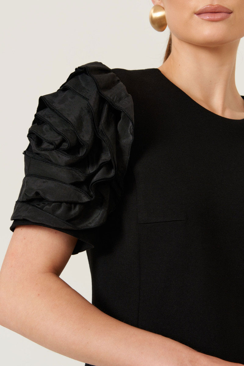 Женское платье для повседневной носки из поливискозной ткани. Передняя часть украшена двумя нагрудными вытачками, что обеспечивает хорошую посадку и аккуратность силуэта. В изделии присутствует бочок, который добавляет комфорт и свободу движений. Спинка выполнена со средним швом и оснащена потайной застежкой-молнией в шве для удобства надевания и снятия. Горловина расширенная. Короткие рукава украшены декоративной настрочной розой, придающей образу оригинальность и стильность. Цвет платья — черный, универсальный и легко сочетаемый с различными аксессуарами. Длина платья — миди, что делает его подходящим для различных повседневных ситуаций.