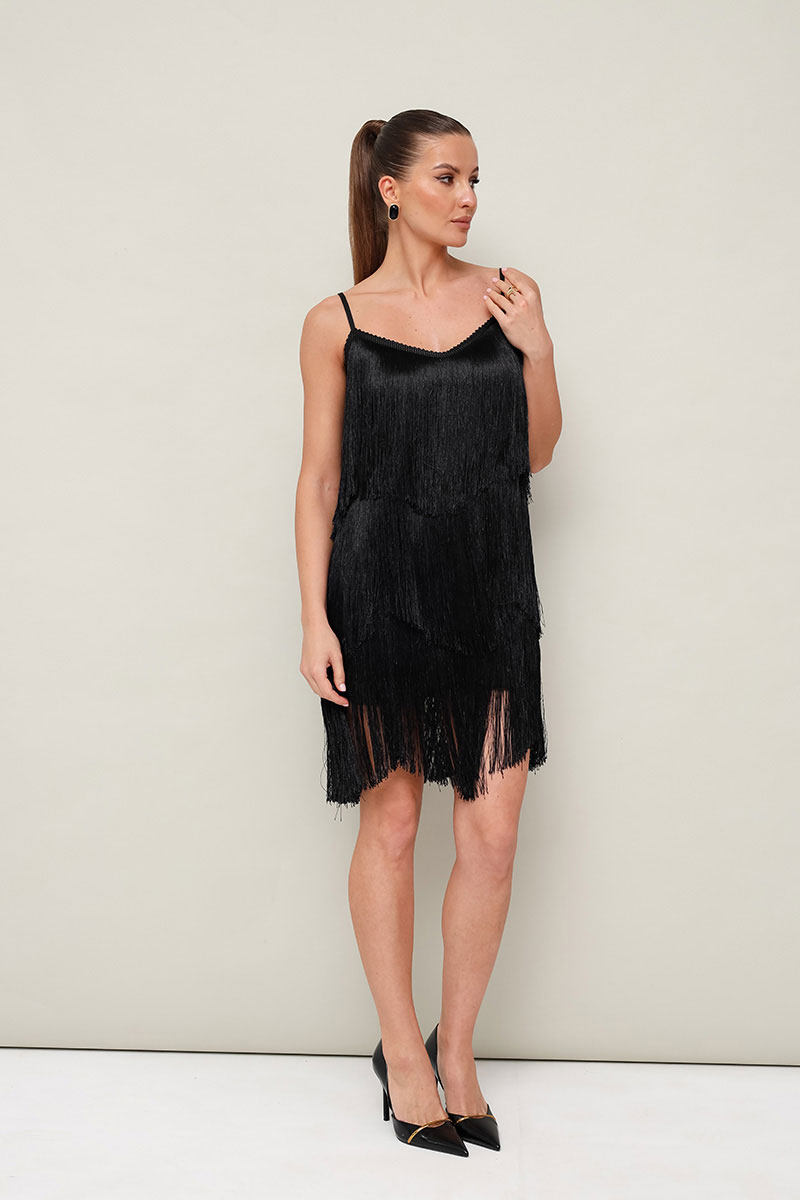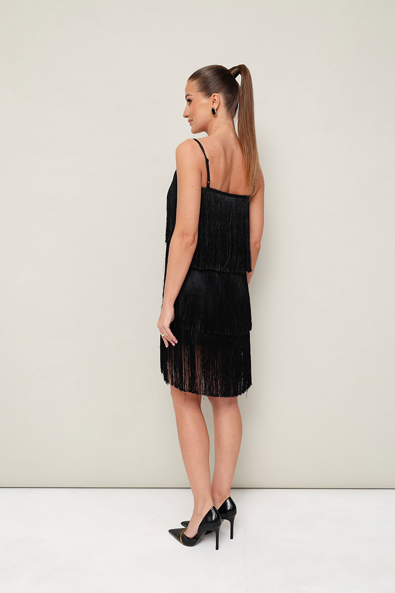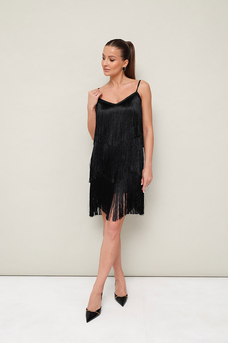 Нарядное платье, декорированное отделочной бахромой. Бахрома пришивная, ниточки не вылазят. Шлейки регулируются по длине.