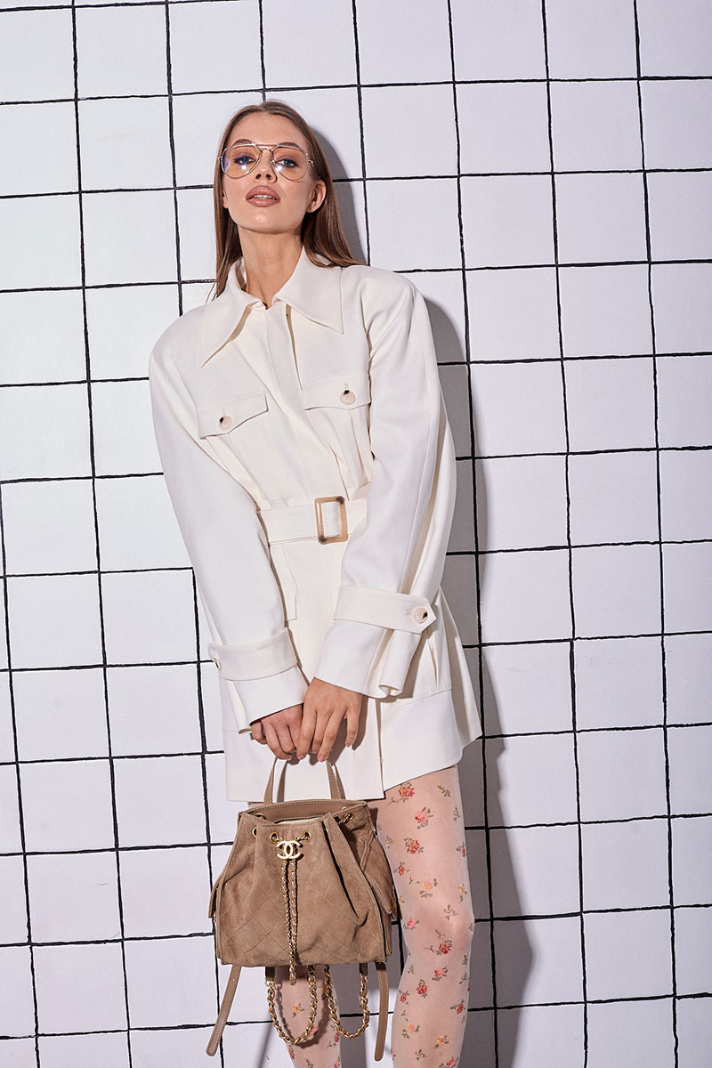 Платье прямого силуэта, на подкладке, выполнено из костюмной ткани. Рукав реглан с плечевой накладкой, по низу рукава паты и пуговицы. Платье на потайной застежке молнии и пуговицы. По переду изделия расположены карманы с клапаном. На спинке отлетная кокетка. В комплекте к платью идет пояс.