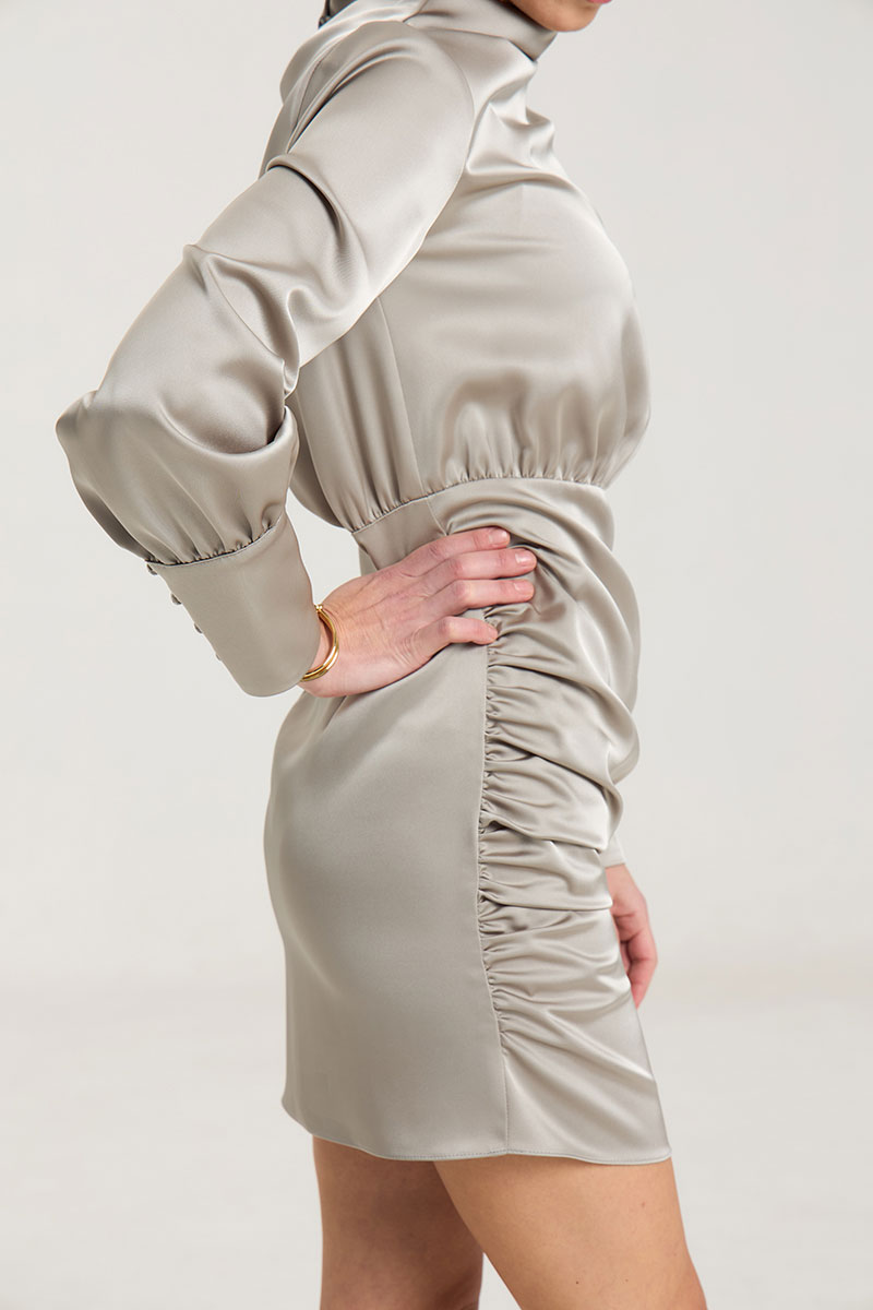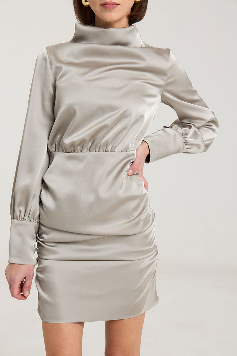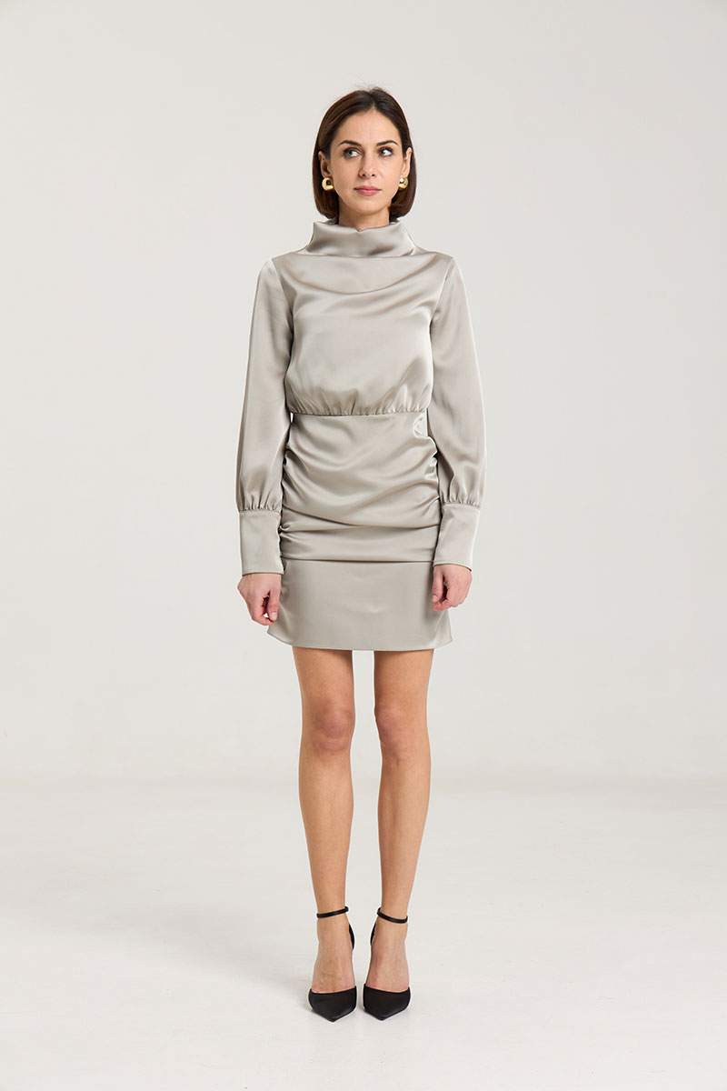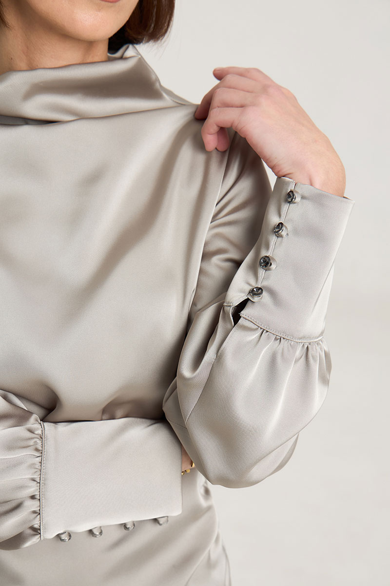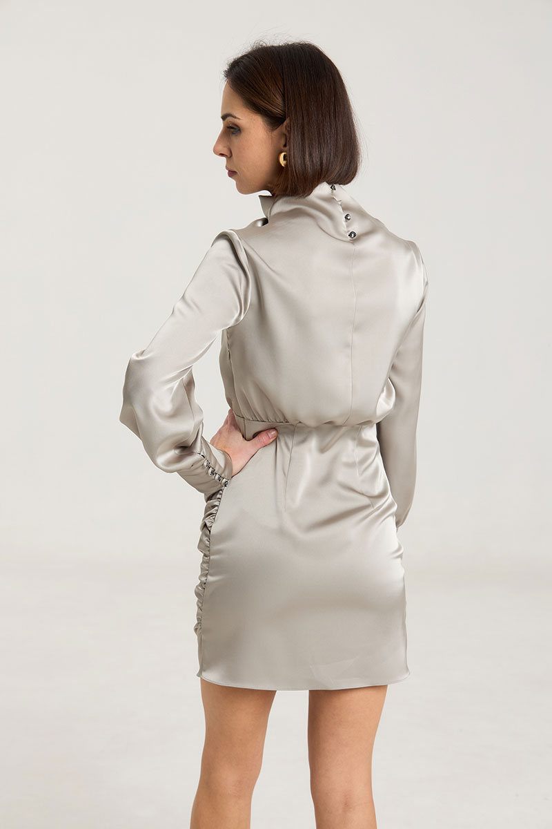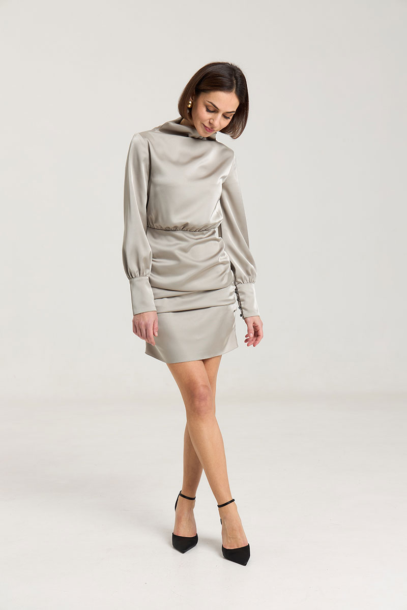 Платье с драпировкой, талия отрезная, прилегающего силуэта, рукав втачной, с высокой манжетой с застежкой на петли-пуговицы. Воротник цельнокроеный, стойка, в боковом шве застедка на молнию, на горловине застежка на петли-пуговицы. Платье без подклажки, выполнено из плотнойй атласной ткани красиво подчеркивает фигуру. Рост модели 168 см.