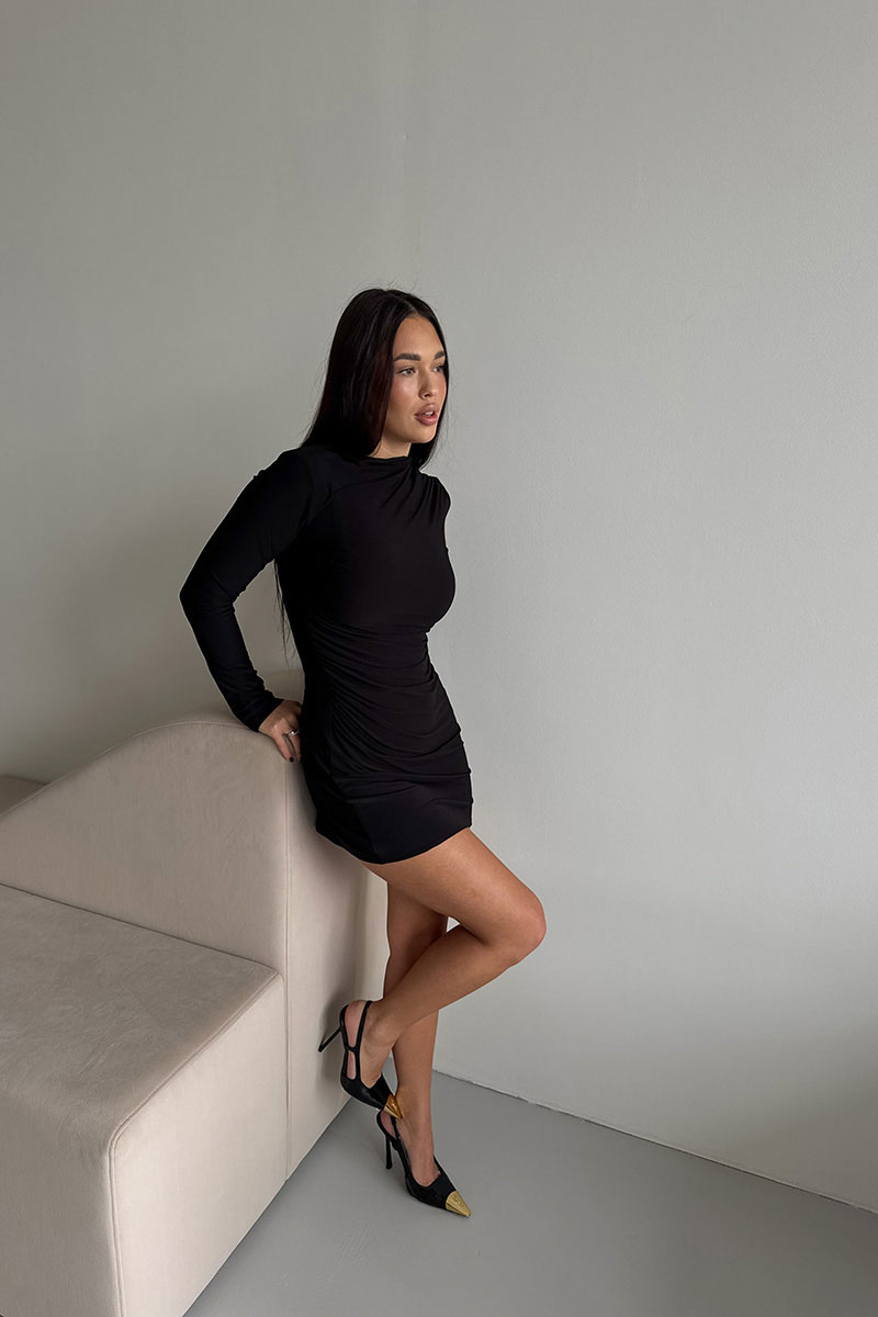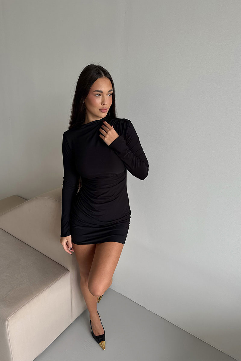 Платье в длине мини приталенного кроя, с красивой линией декольте и сборкой на талии.