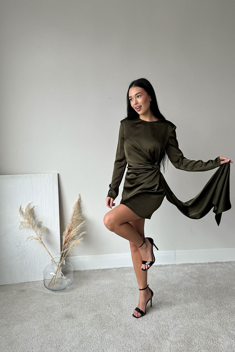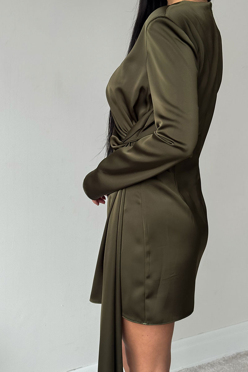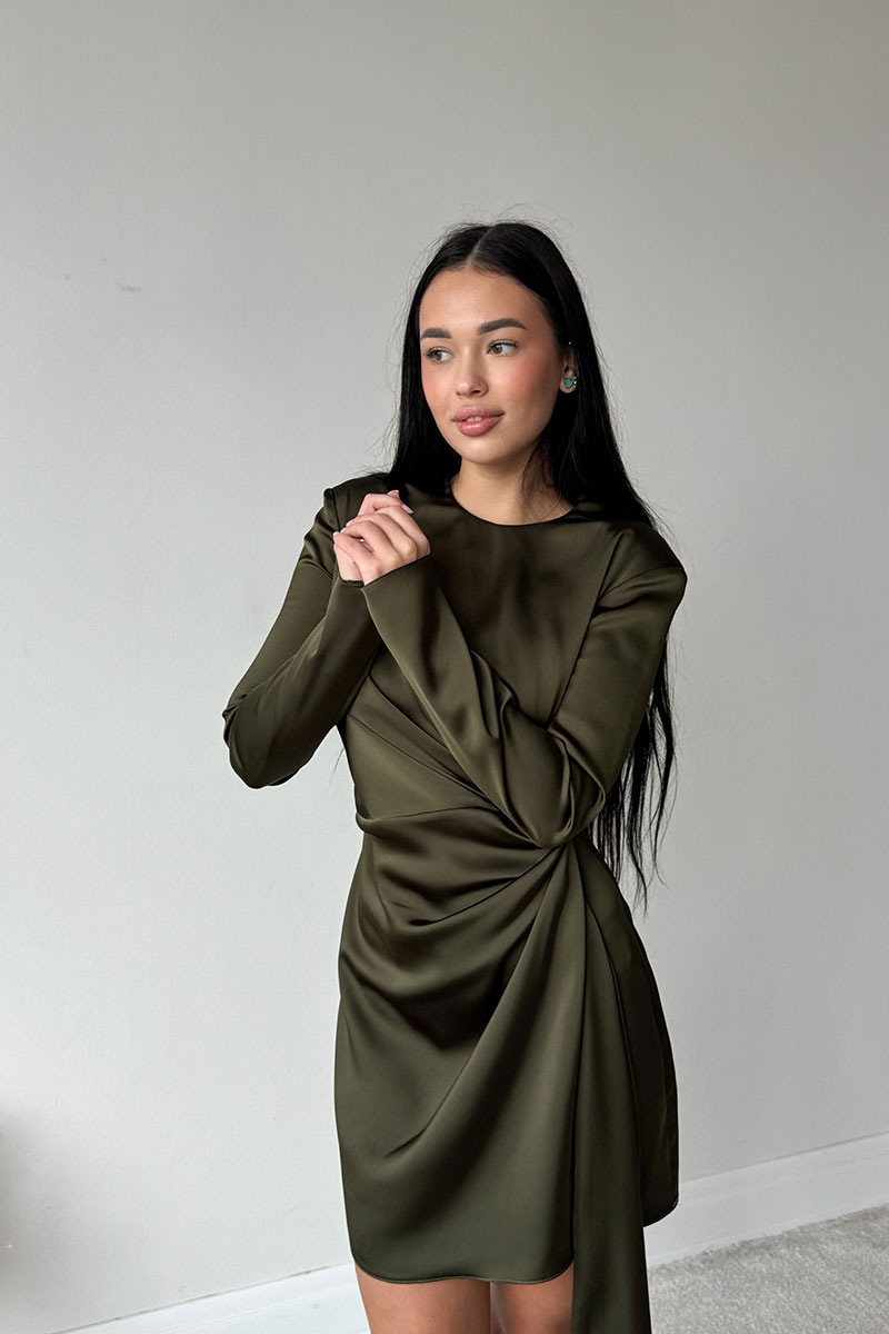 Платье из плотного атласа, с акцентным элементом в виде шлейфа сбоку изделия. Рост модели 168 см.