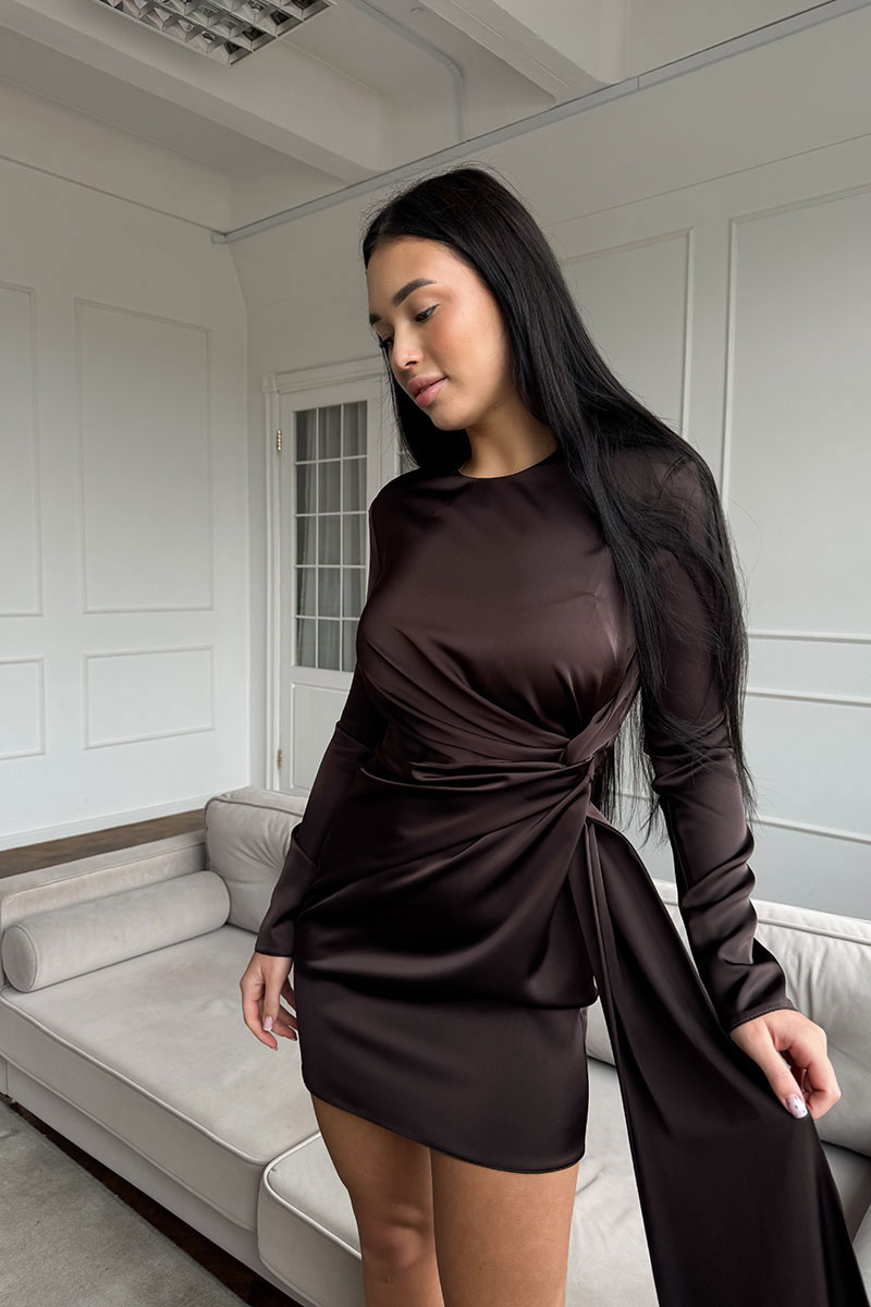 Платье из плотного атласа, с акцентным элементом в виде шлейфа сбоку изделия. Рост модели 168 см.
