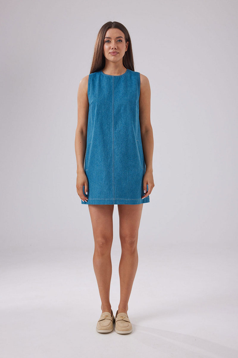 Женское платье А-образного силуэта длиной мини. Платье выполнено из джинсового полотна. Вырез горловины округлый. По полочке и спинке средний шов с декоративной отстрочкой. Без рукавов. Застежка по спинке в среднем шве на потайную тесьму-молнию. По полочке на уровне бедер прорезные карманы.