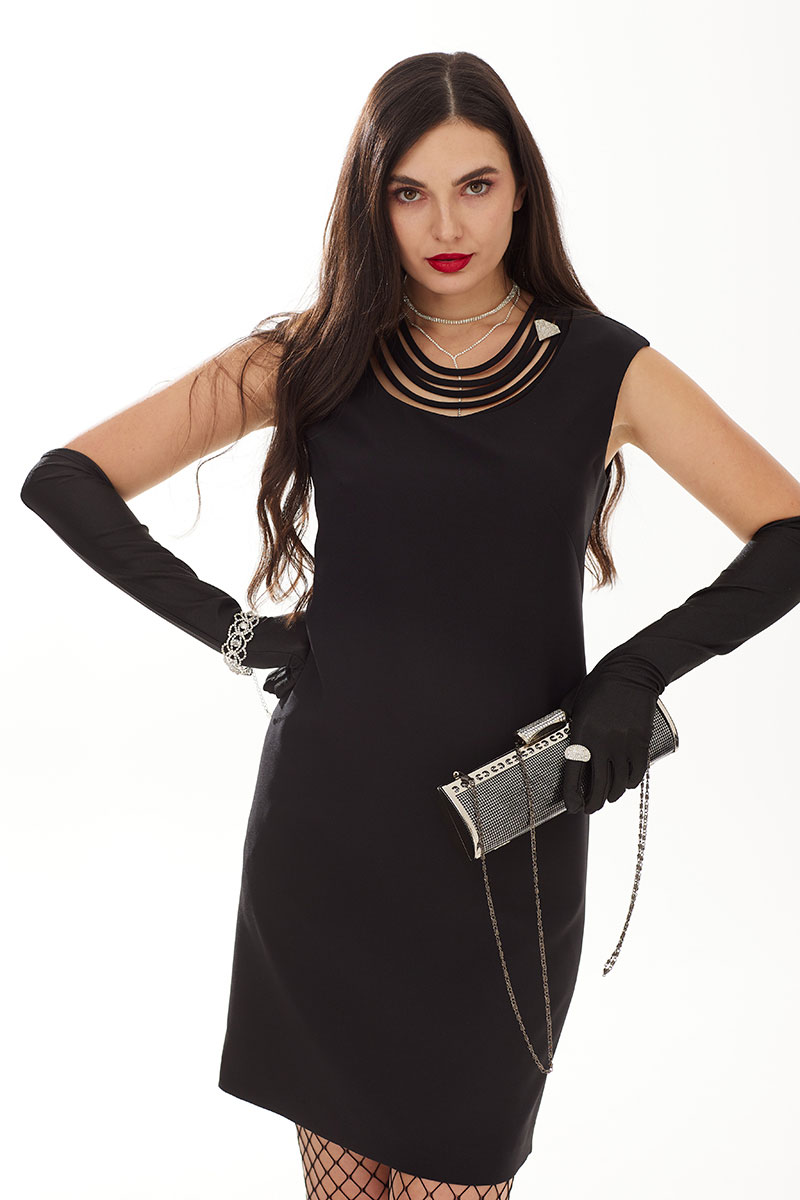 Платье женское, полуприлегающего силуэта, слегка расширенное к низу, длиной миди, со спущенной линией плеча, без рукавов. По переду декольте задекорировано руликами по форме горловины, с декоративной брошкой. На спинке платья расположены талиевые выточки и средний шов, с застежкой на "тесьму- молнию". Рукава одношовные до линии локтя. Горловина округлой формы.