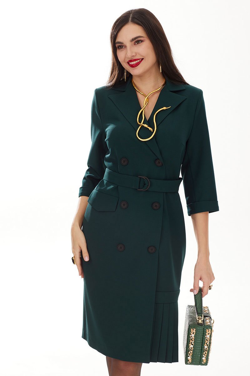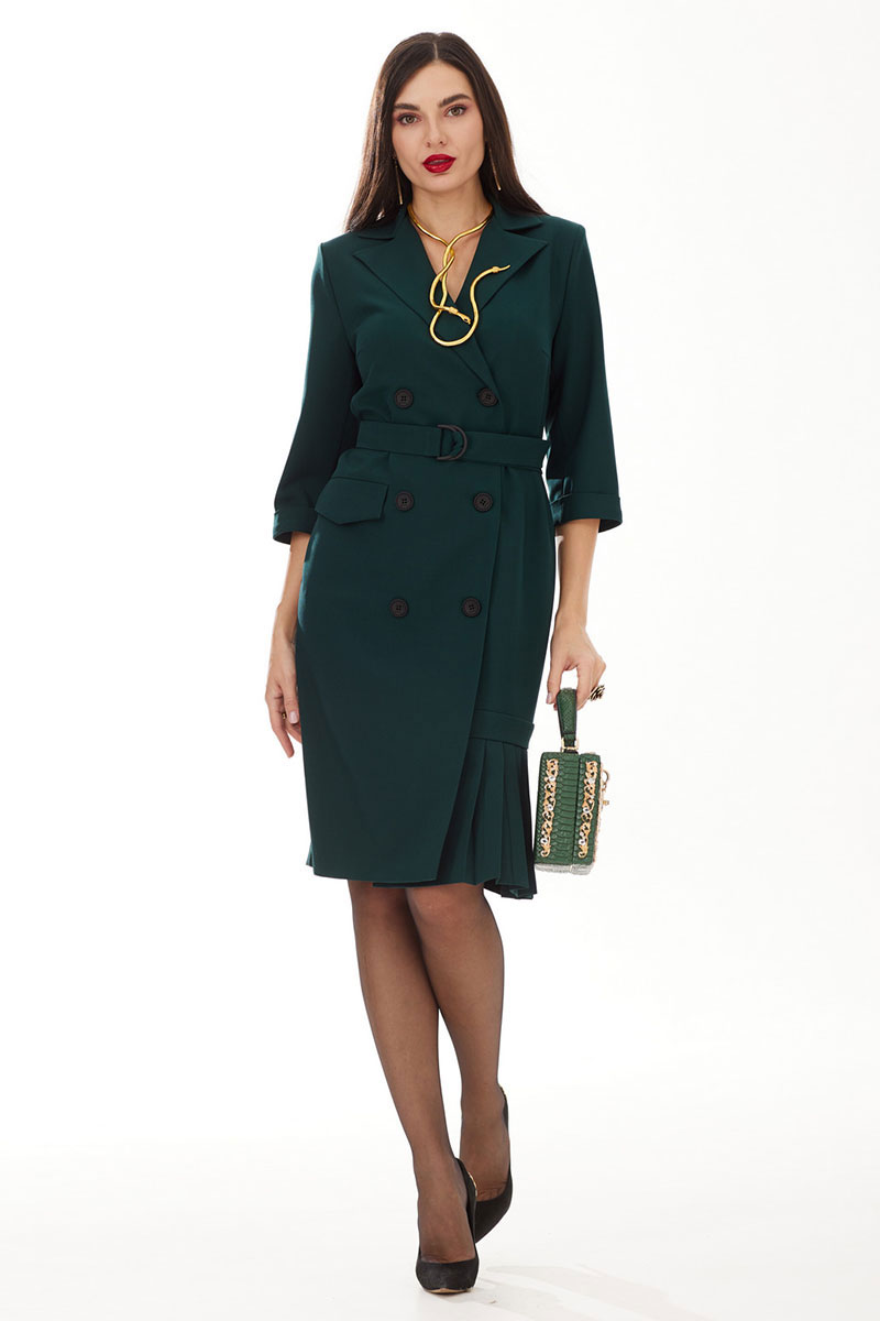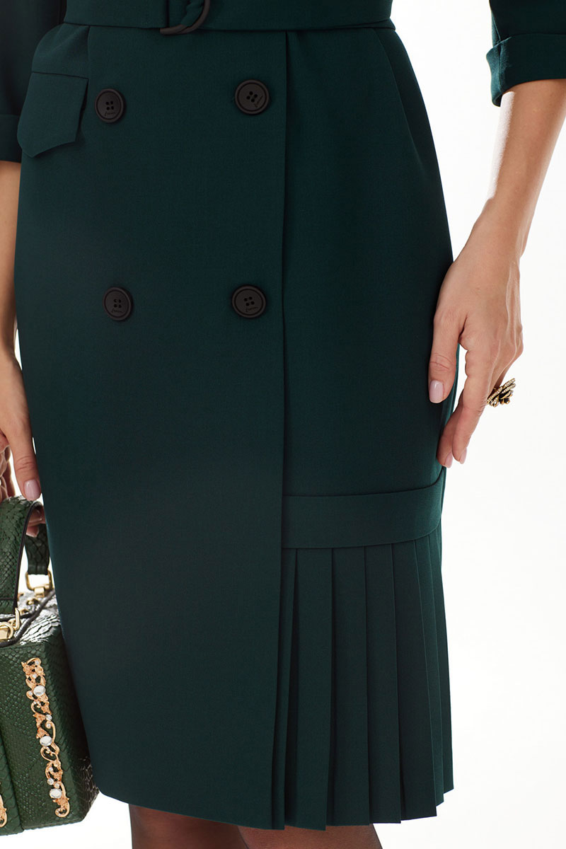 Платье женское полуприлегающего силуэта с двухбортной застёжкой на петли и пуговицы. По переду расположены нагрудные вытачки. На левой части переда - горизонтальный подрез с планкой. Нижняя часть оформлена заутюженными складками, направленными к боковому шву. По правой части переда, в области бедер, расположен горизонтальный прорезной карман с листочкой и клапаном. Спинка цельная с вертикальными талиевыми вытачками. Рукав двухшовный, длиной 3/4, с манжетой по низу рукава. Горловина платья оформлена воротником жакетного типа. В комплект к платью идёт пояс из основной ткани с декоративной пряжкой.