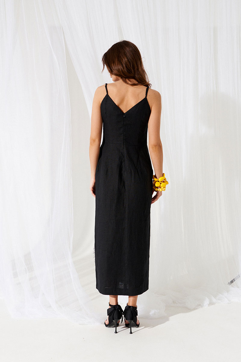 Сарафан женский, полуприлегающего силуэта, на регулируемых бретелях, с V-образным вырезом горловины, с застежкой на потайную молнию в среднем шве спинки. Перед отрезной по линии талии, с нагрудными вытачками. По переду — асимметричный рельефный шов, оформленный воланом, с разрезом от середины бедра. Край волана обработан декоративной тесьмой. Спинка отрезная по талии, со средним швом, и талиевыми вытачками.