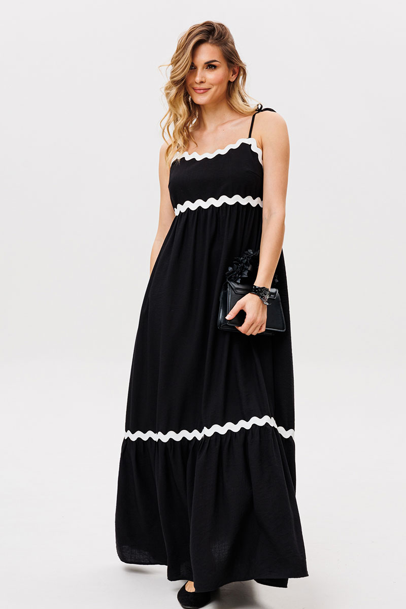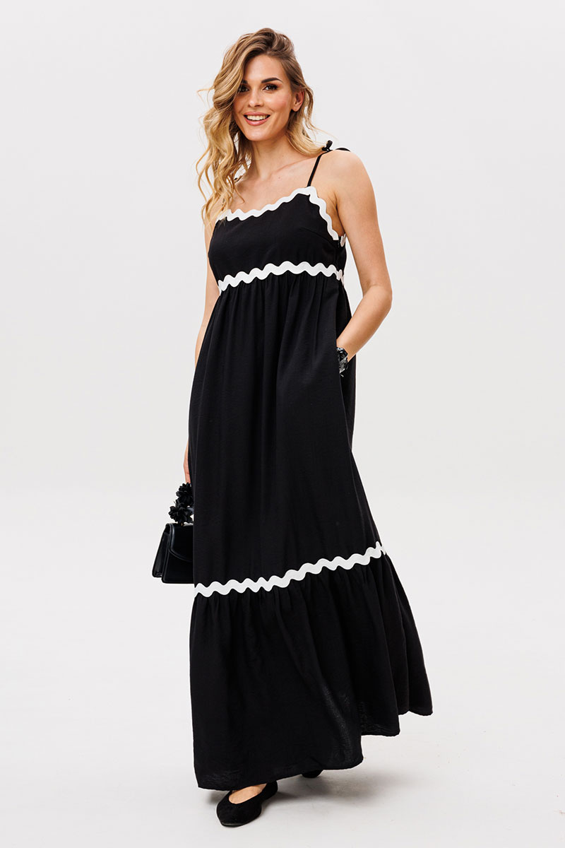 Сарафан выполен из плательно-блузочной ткани. Сарафан А-образного силуэта, длиной миди. Сарафан отрезной под грудью. Юбка сарафана состоит из двух ярусов. В левом боковом шве застежка на потайную молнию. В боковых швах карманы. Сарафан на регулируемых бретелях из основной ткани. Сарафан декорирован контрастной тесьмой.