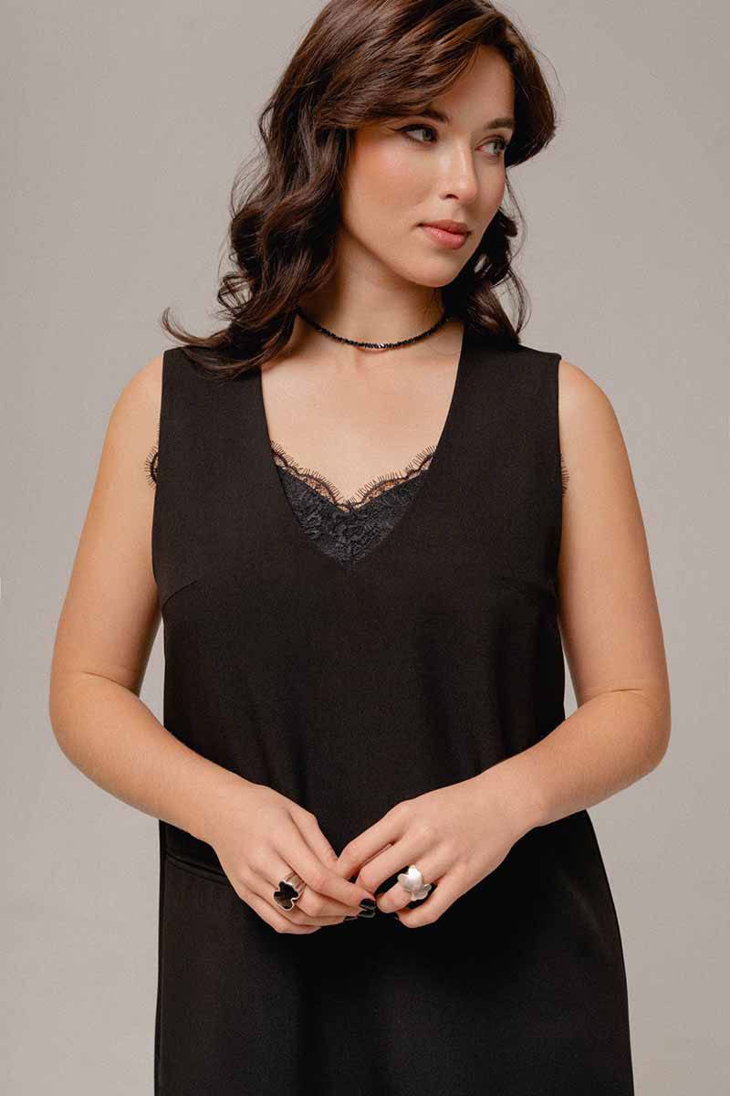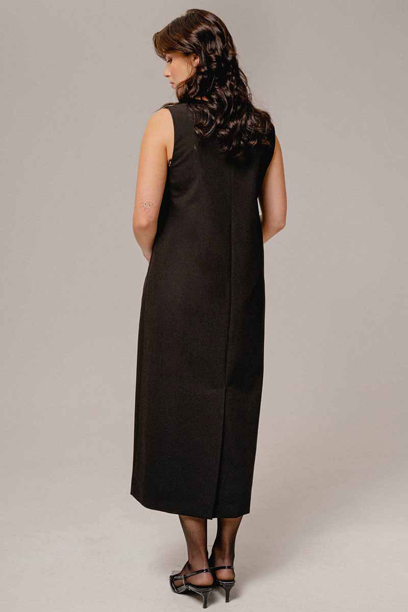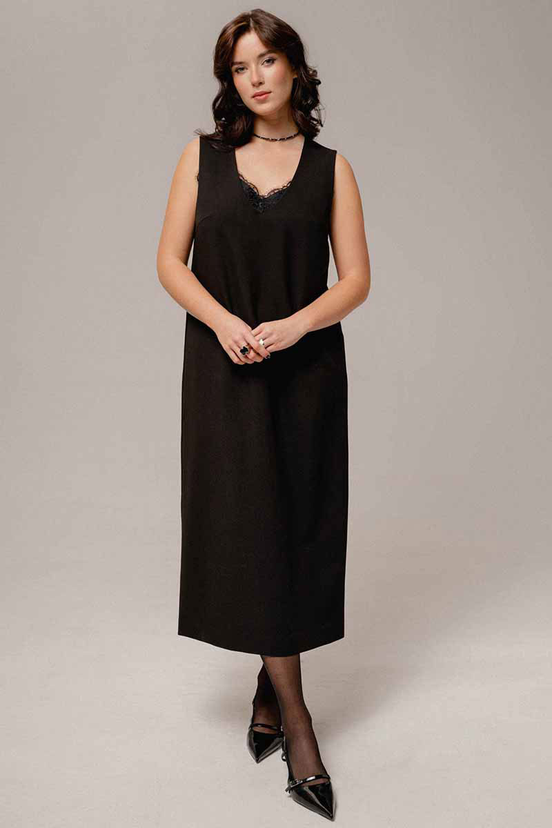 Сарафан женский О-образного силуэта из ткани однотон. Горловина по переду V-образной формы. Без рукавов,без застежки, со шлицей в среднем шве спинки. Изделие без подкладки. Есть карман по переду с правой стороны ниже талии.