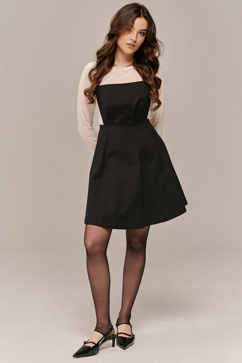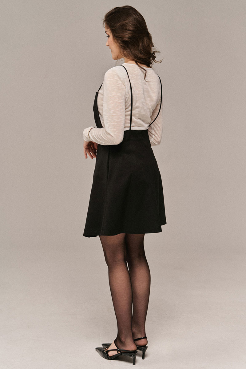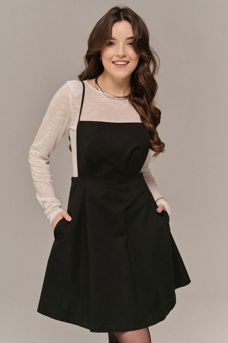 Сарафан молодежный из ткани однотон прилегающего силуэта с подкладкой по низу изделия, с молнией застежкой в среднем шве спинки. По переду грудка и бретели, переходящие в талию по спинке сарафана. Нижняя часть изделия с небольшим расклешением по низу, с карманами в боковых швах.