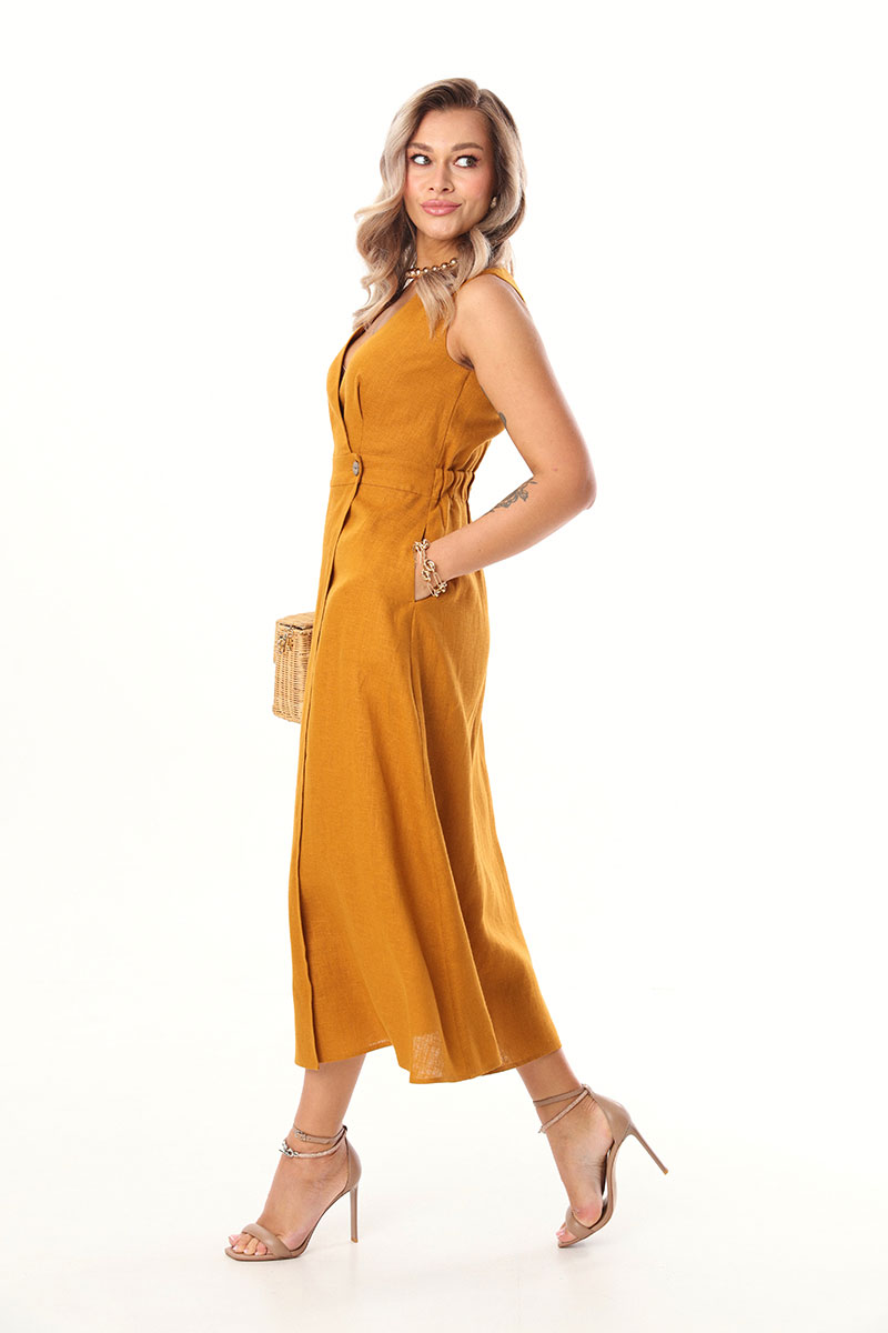 Сарафан "макси" без рукавов с застёжкой на запах на функциональные петли и пуговицы. Вырез декольте V-образный. По линии талии спинки эластичная вставлена эластичная резинка. При надобности, платье легко слегка расширить или заузить по талии, переставив пуговицы.
