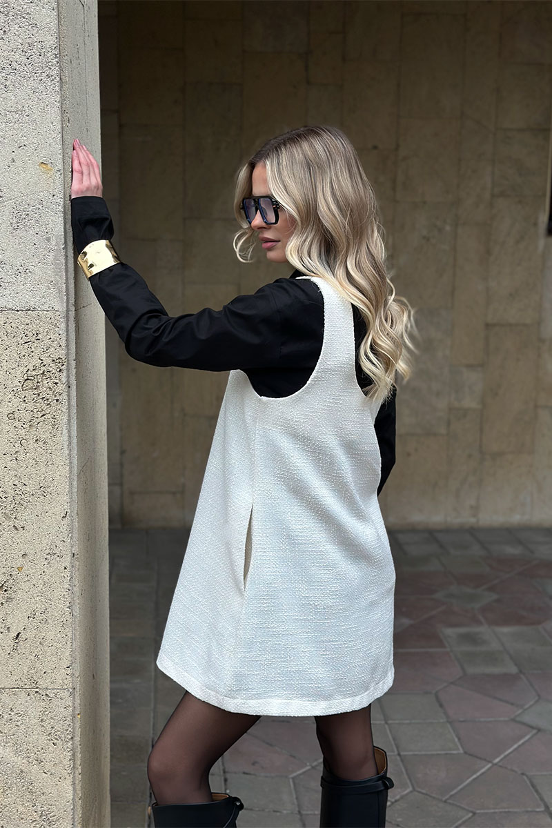 Сарафан из твида, свободного кроя, втачные карманы по бокам.