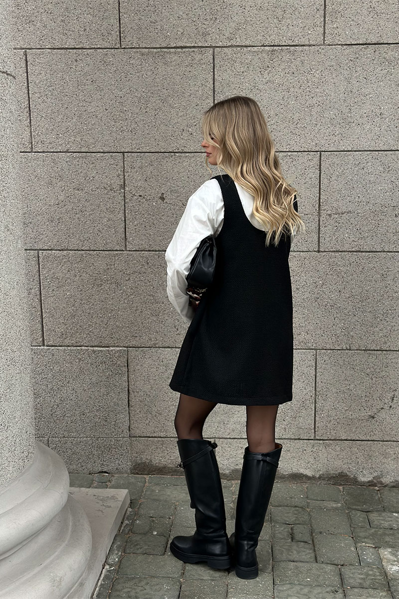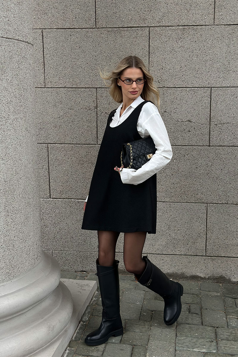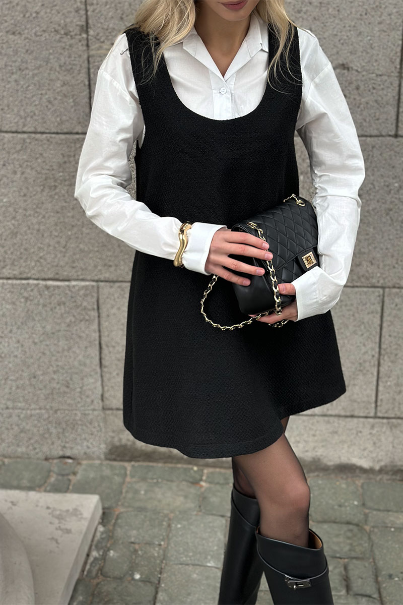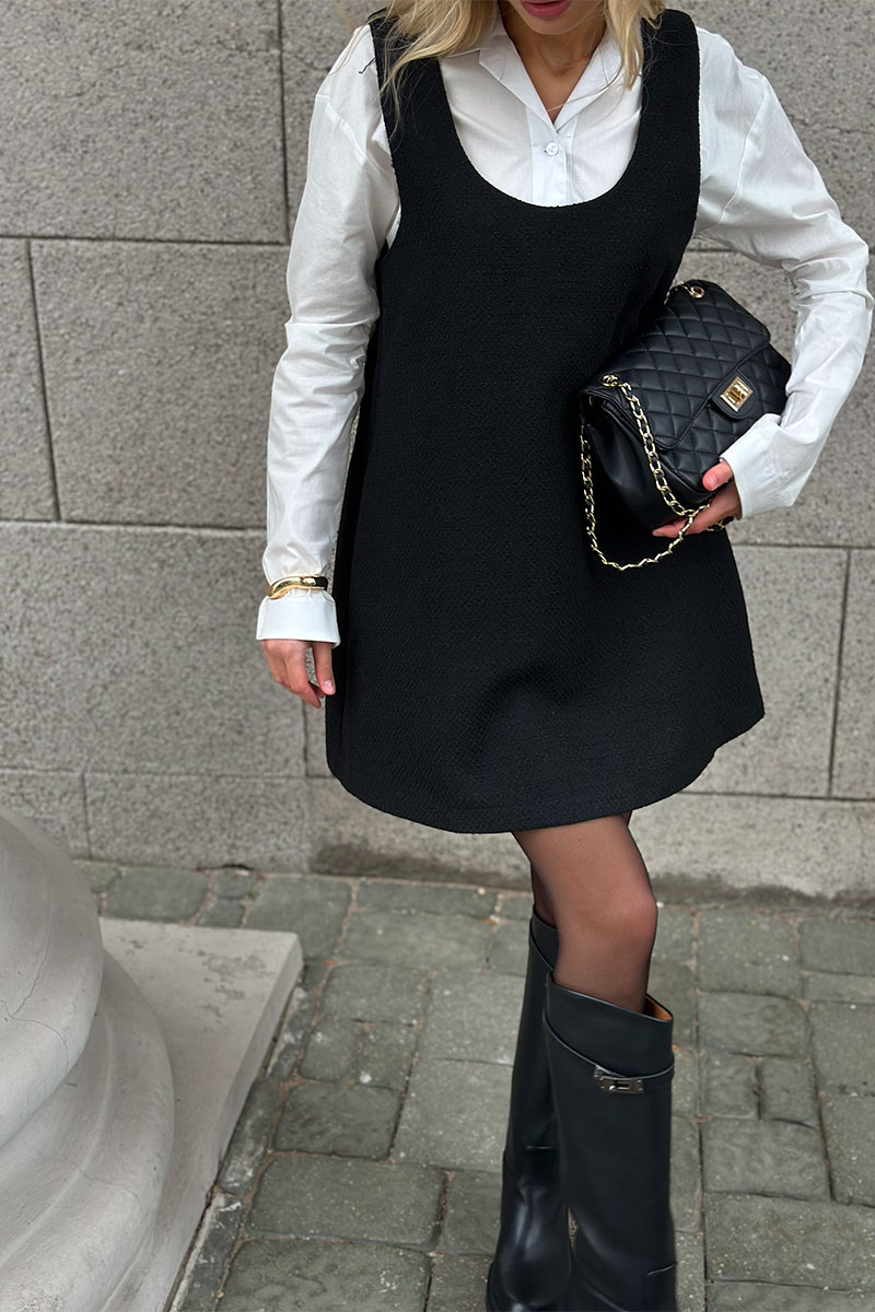 Сарафан из твида, свободного кроя, втачные карманы по бокам.