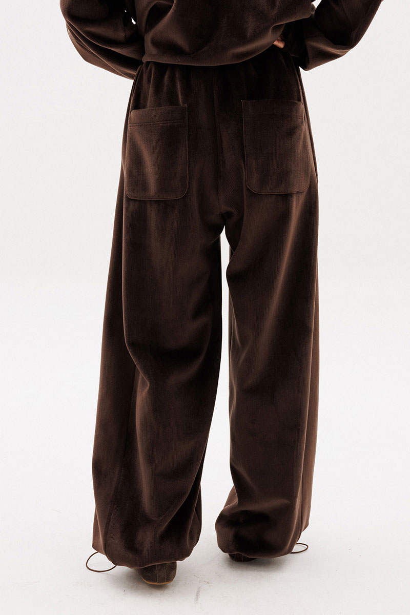 Брюки на притачном поясе с эластичной тесьмой, прямого силуэта, длиной в пол, покроя "oversize". Боковой шов заменен лампасом. В швах лампаса карманы. Сзади накладные карманы. В пояс протянут шнур с наконечниками. По низу брюк втянута эластичная тесьма с фиксаторами. Лампасы и пояс выполнены из основной ткани, но без рубчика.
