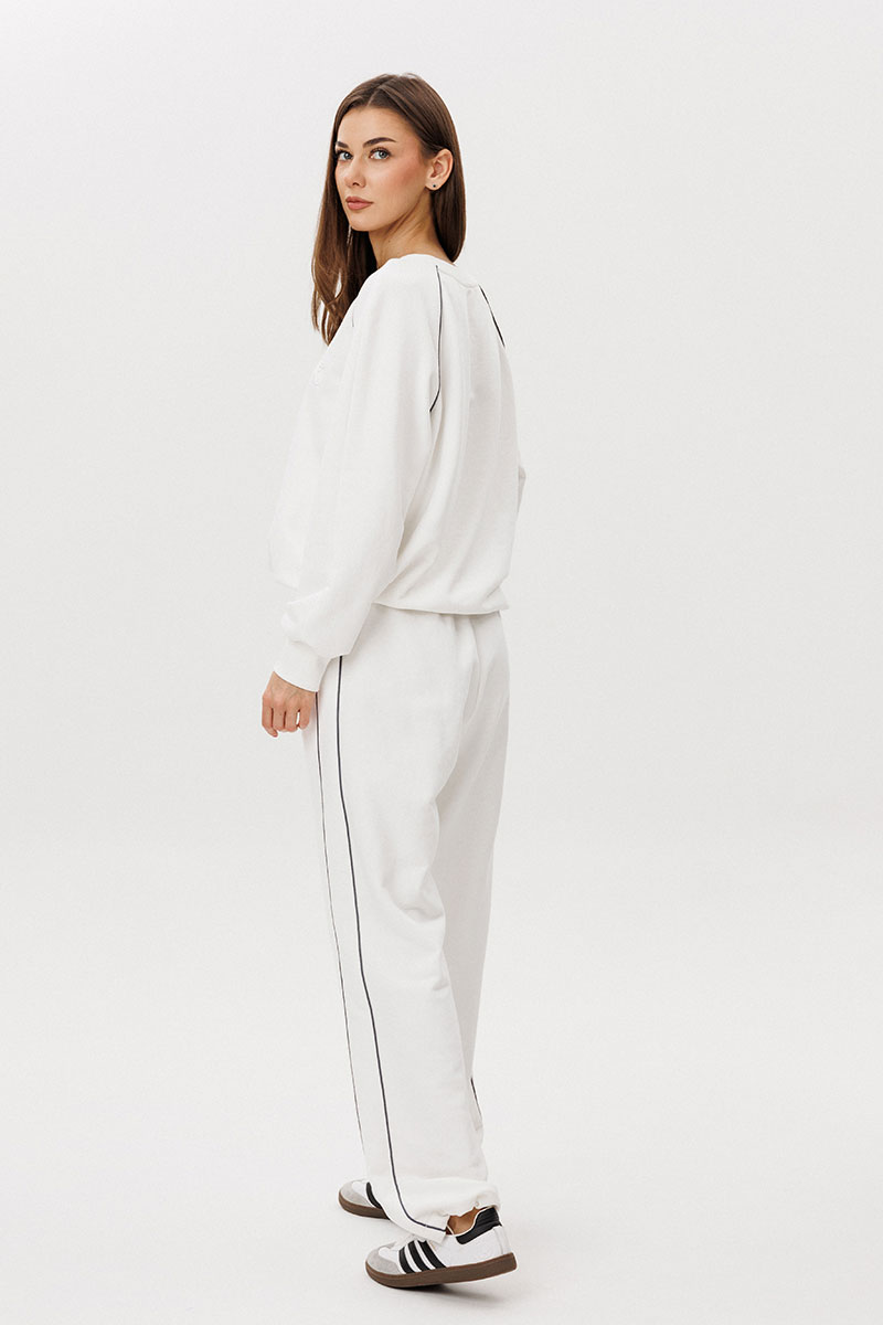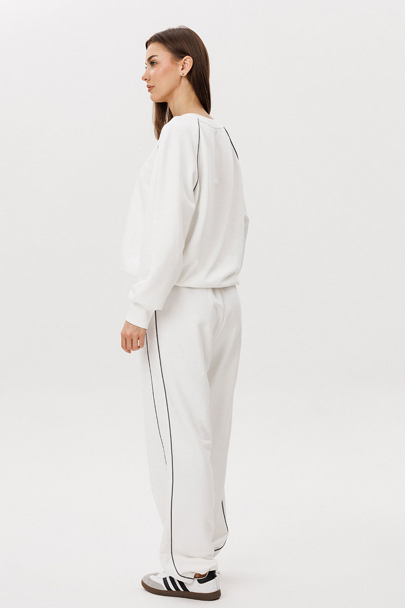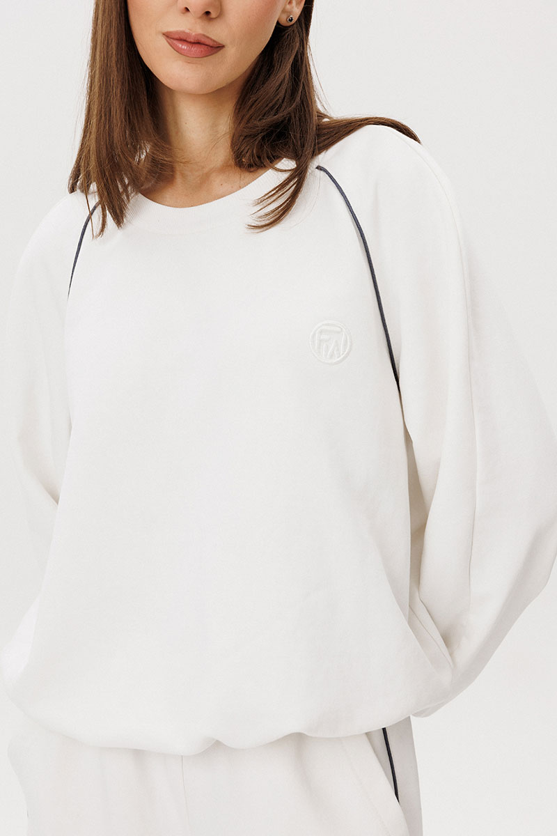 Свободный свитшот покроя реглан с отделочными контрастными кантами по линии притачивая рукава и брендовой вышивкой на полочке.