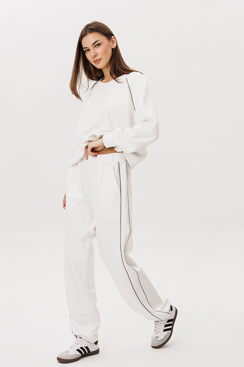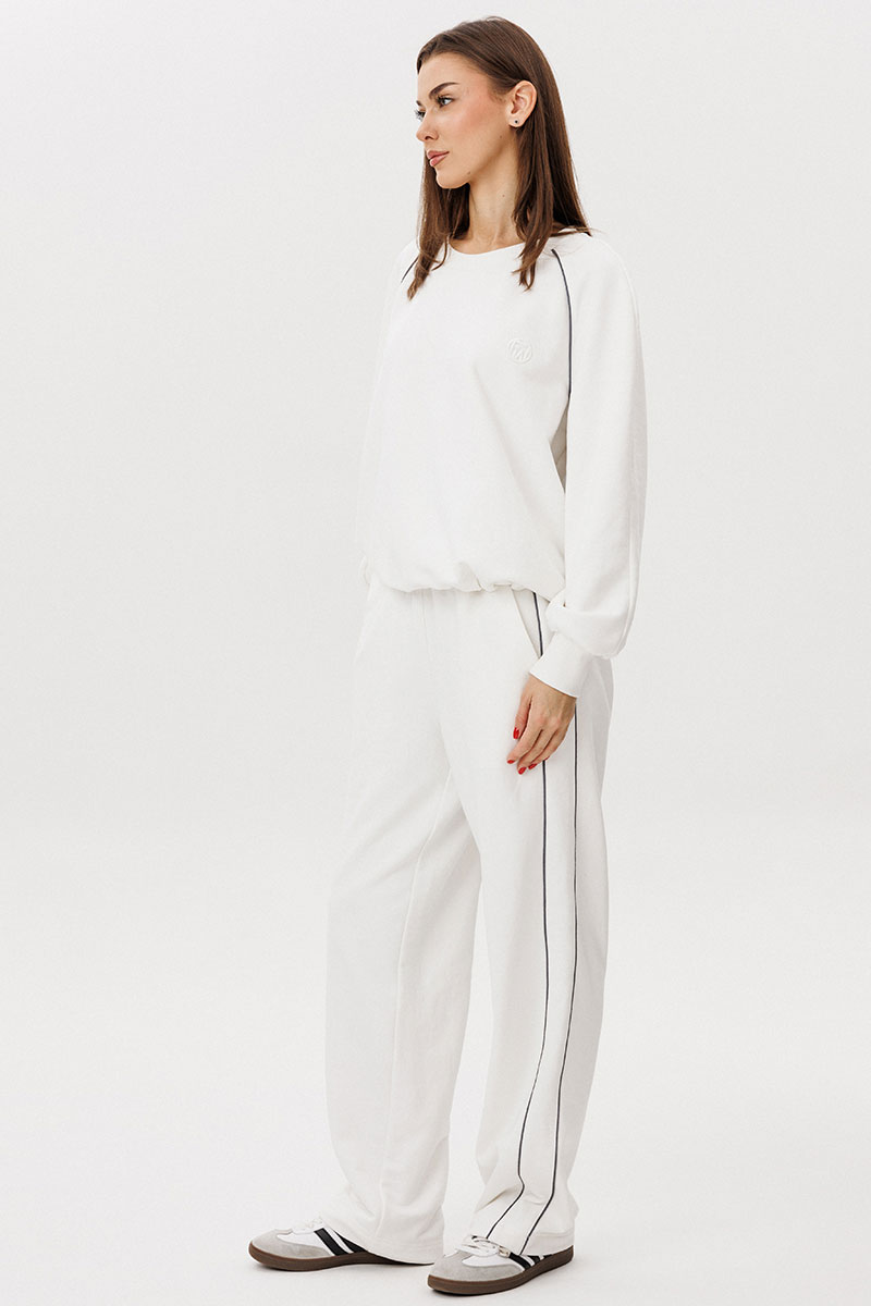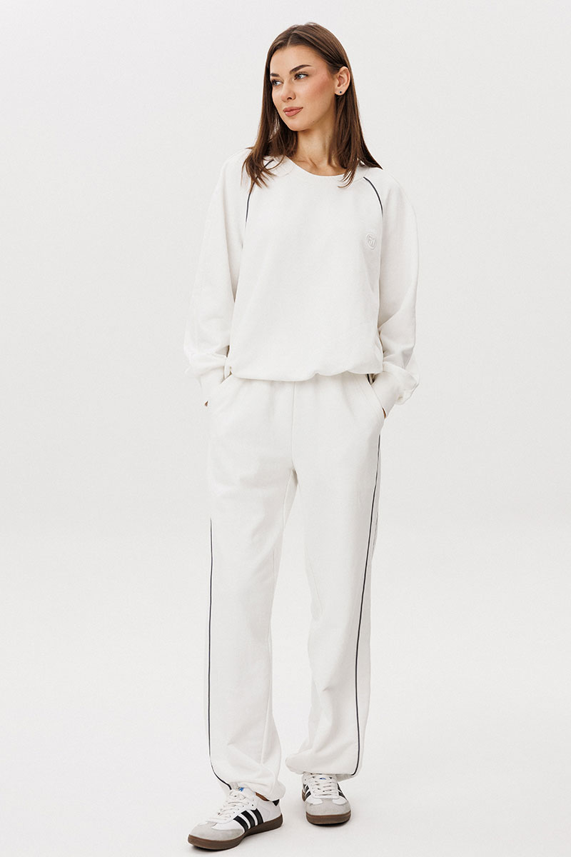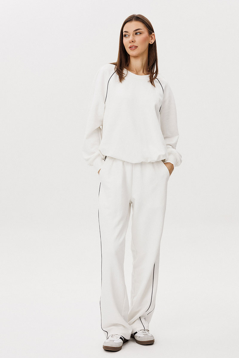 Свободный свитшот покроя реглан с отделочными контрастными кантами по линии притачивая рукава и брендовой вышивкой на полочке.