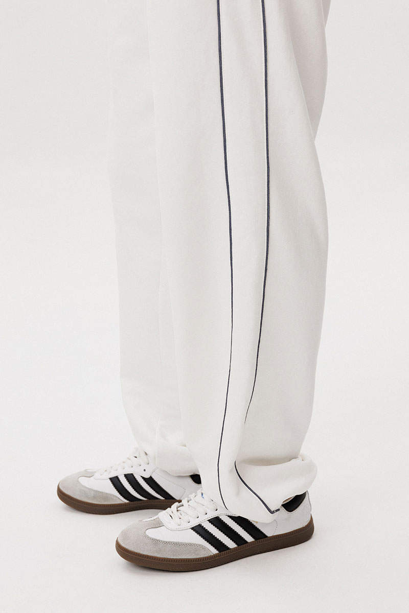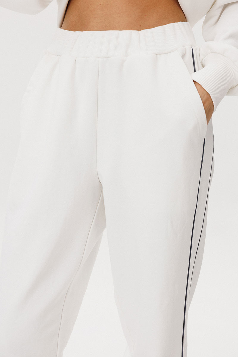 Брюки свободные, расслабленные, на эластичном поясе, с отрезным лампасом, декорированным отделочным кантом. По низу брюк-кулиса с эластичной тесьмой и фиксатором эффектно меняющая стиль брюк с прямого в " алладины".