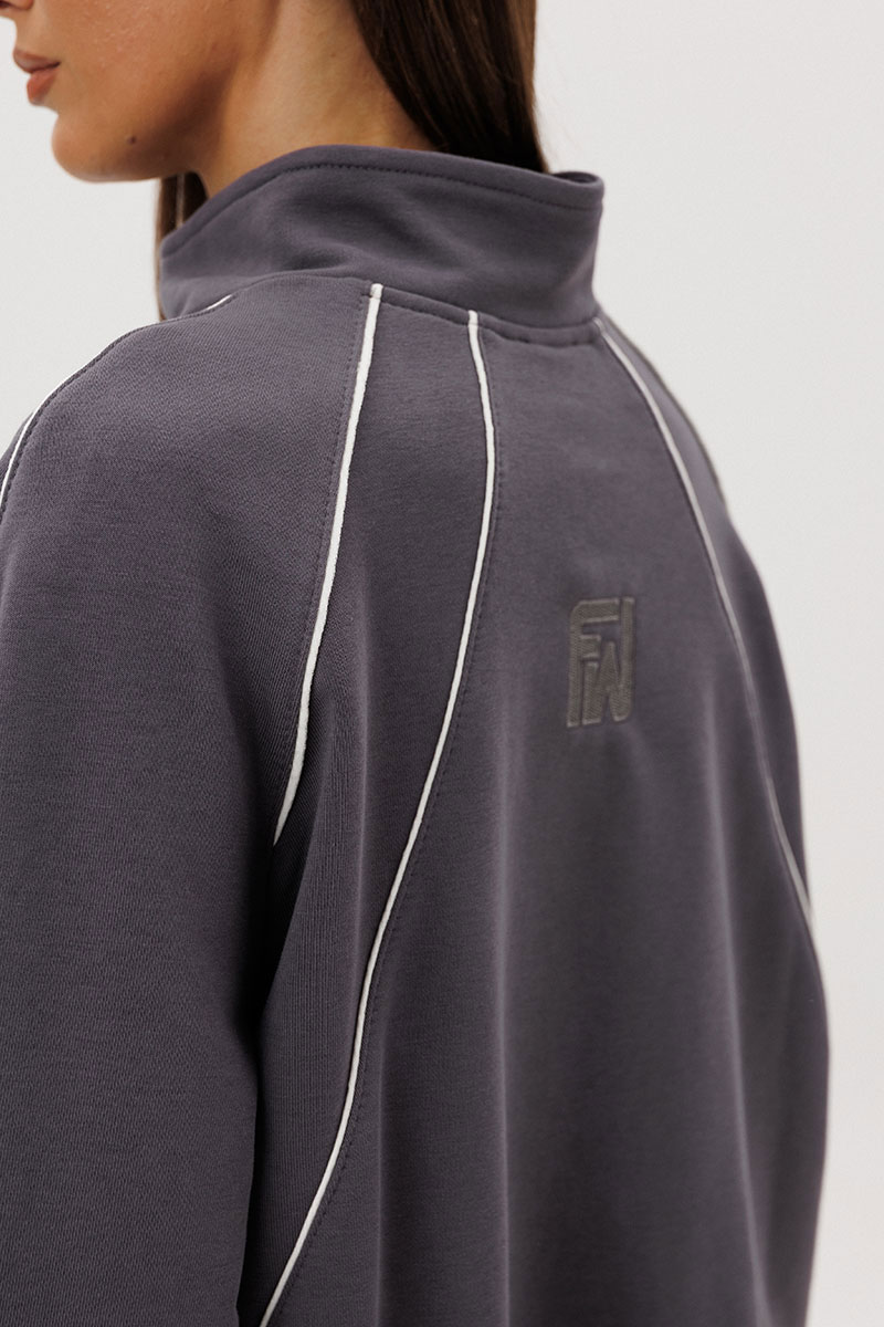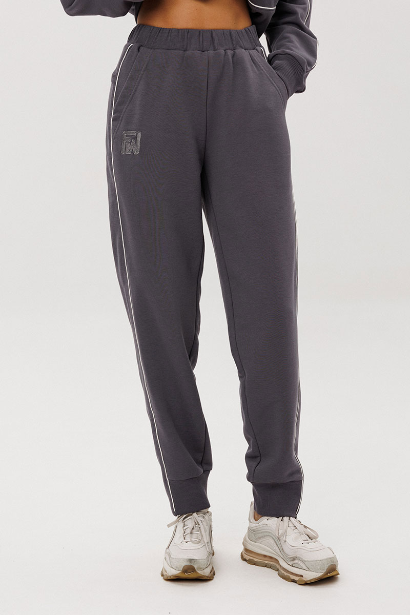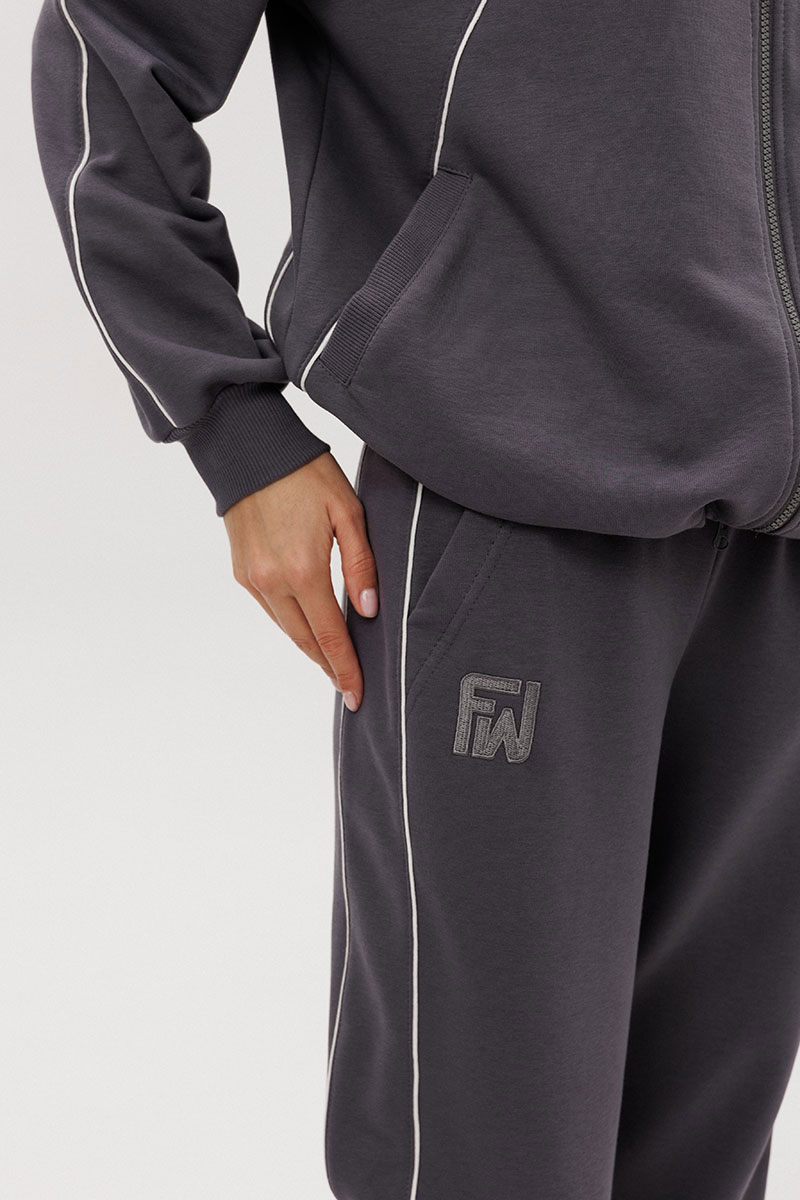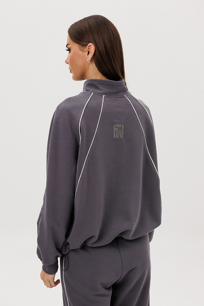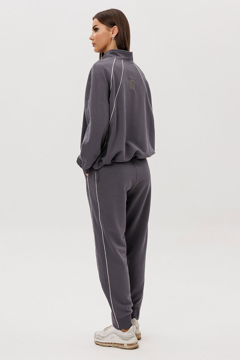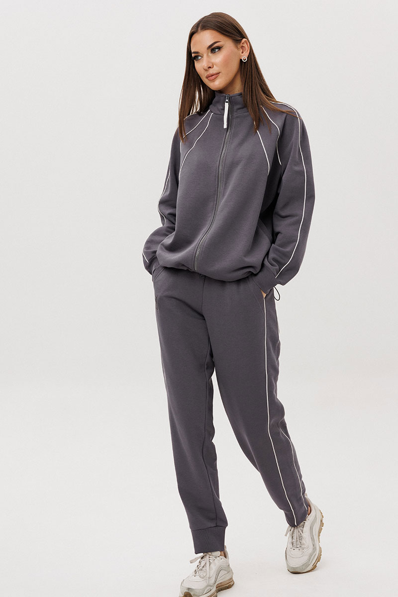 Джемпер покроя реглан с аккуратной стойкой и застёжкой-молнией украшен контрастными кантами, придающими образу динамику. Брюки со слегка зауженным силуэтом и манжетами по низу дополнены эластичным поясом для удобной посадки.