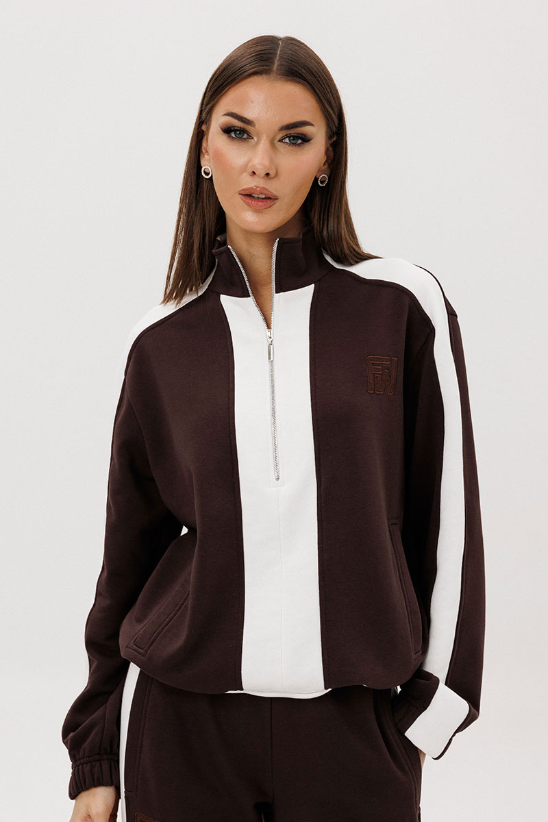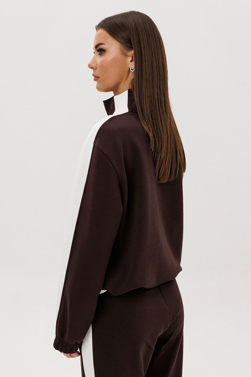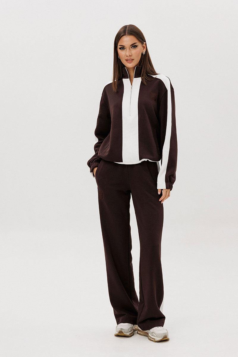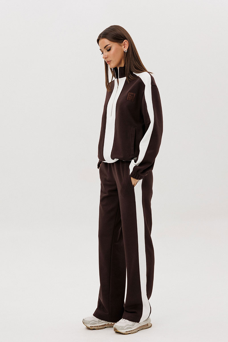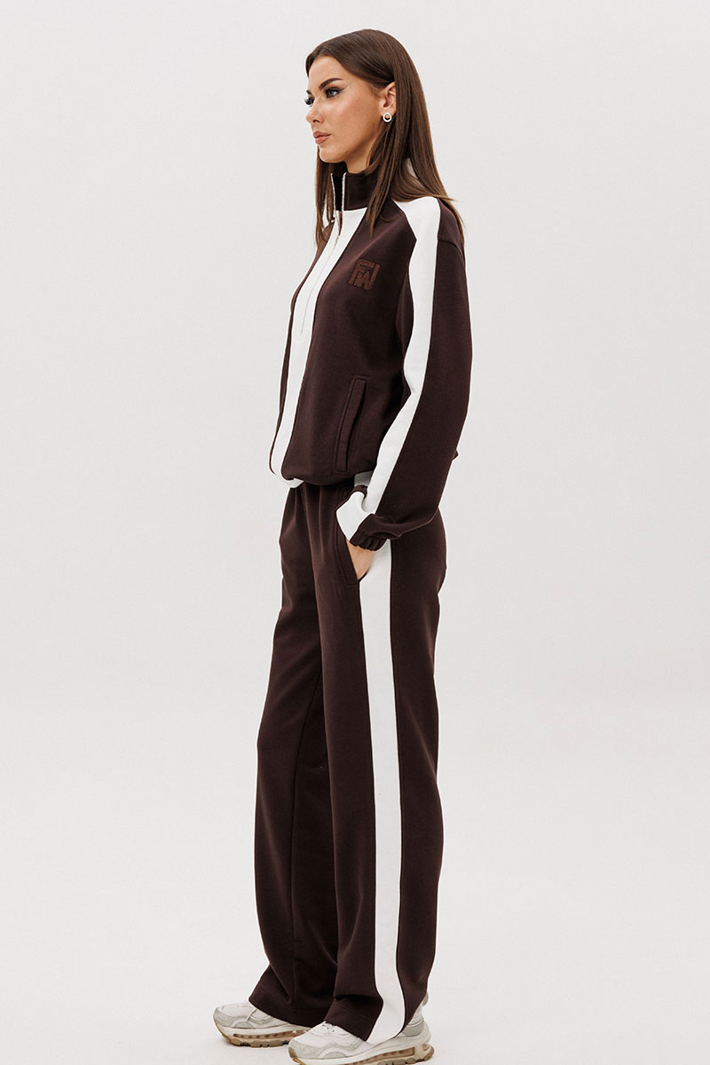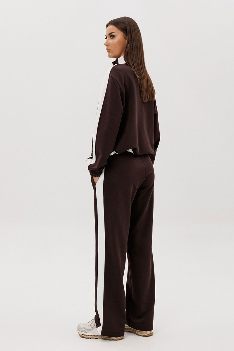 Контрастные лампасы на брюках, рукавах, по центру переда и низу придают модели особую динамичность и изысканность.
