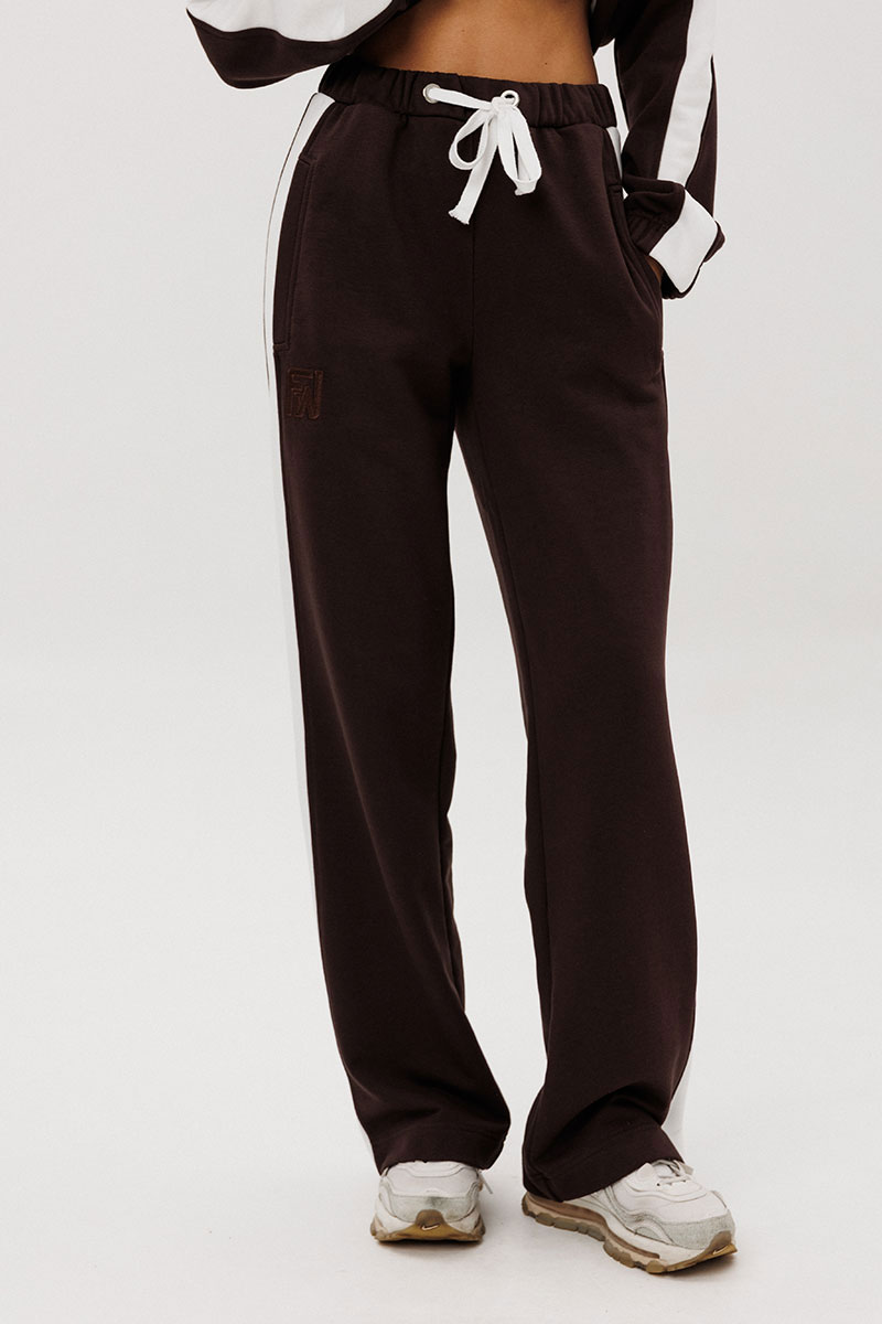 Брюки свободные, прямые на притачном эластичном поясе с контрастными лампасами и карманами с листочками в боковых швах.