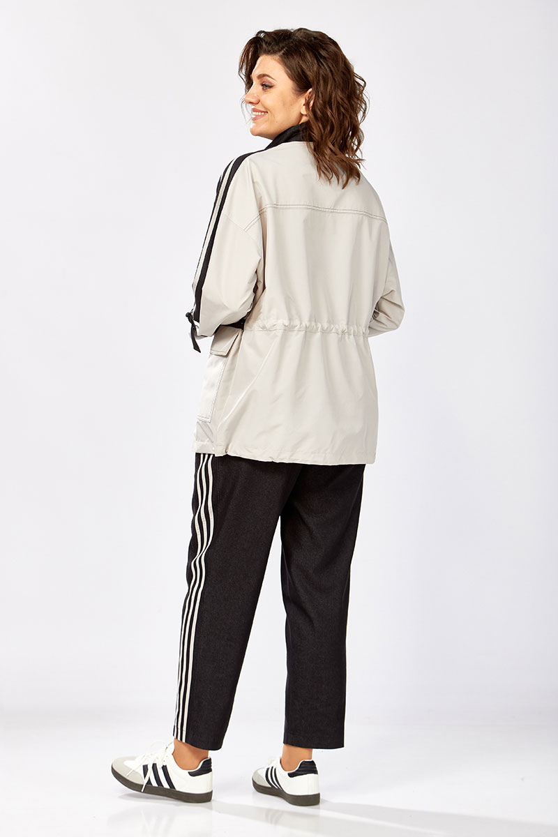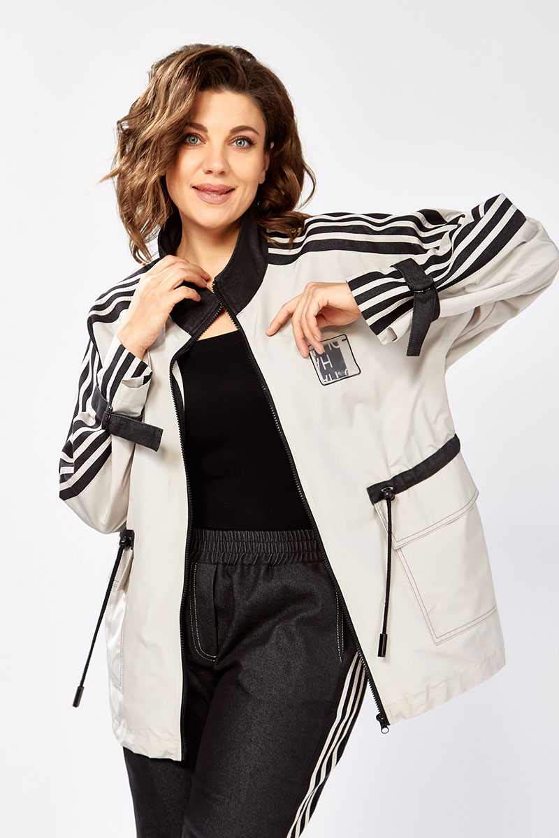 Удлиненная куртка-ветровка без подкладки, по талии с кулисой, свободного силуэта на молнии, с накладными карманами, воротник - высокая отложная стойка, по рукаву контрастная отделка и регулируемый хлястик. Спинка с кокеткой.
