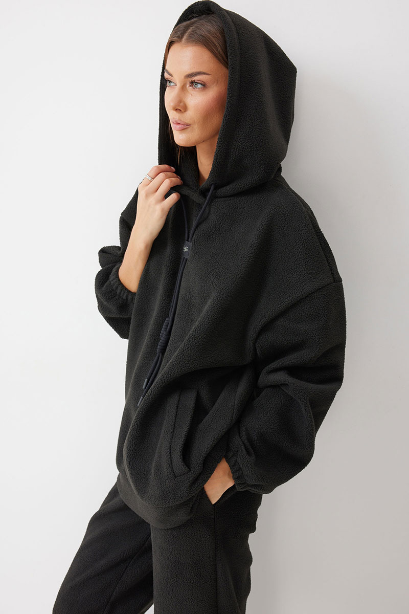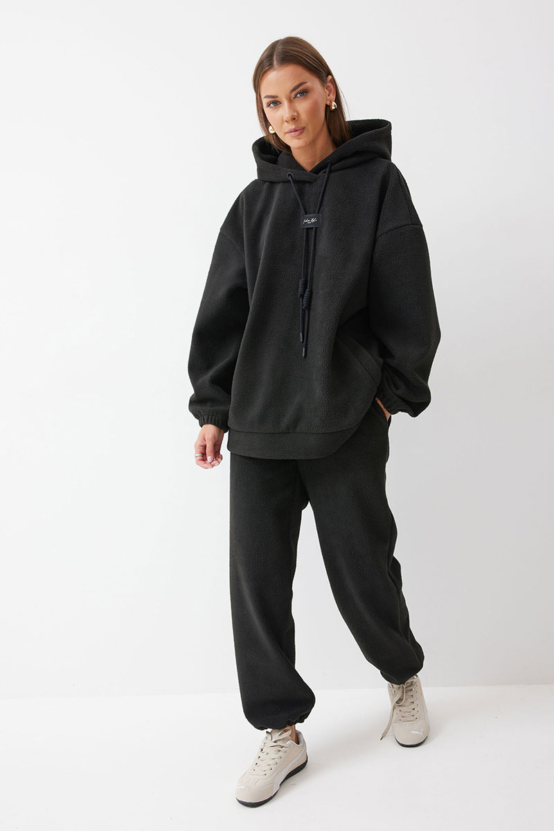 Джемпер прямого силуэта из комфортного трикотажного полотна. Горловина обработана капюшоном. Рукав со спущенной линией плеча, по низу на резинке. По низу джемпера притачной пояс. По переду декоративная нашивка и шнур.