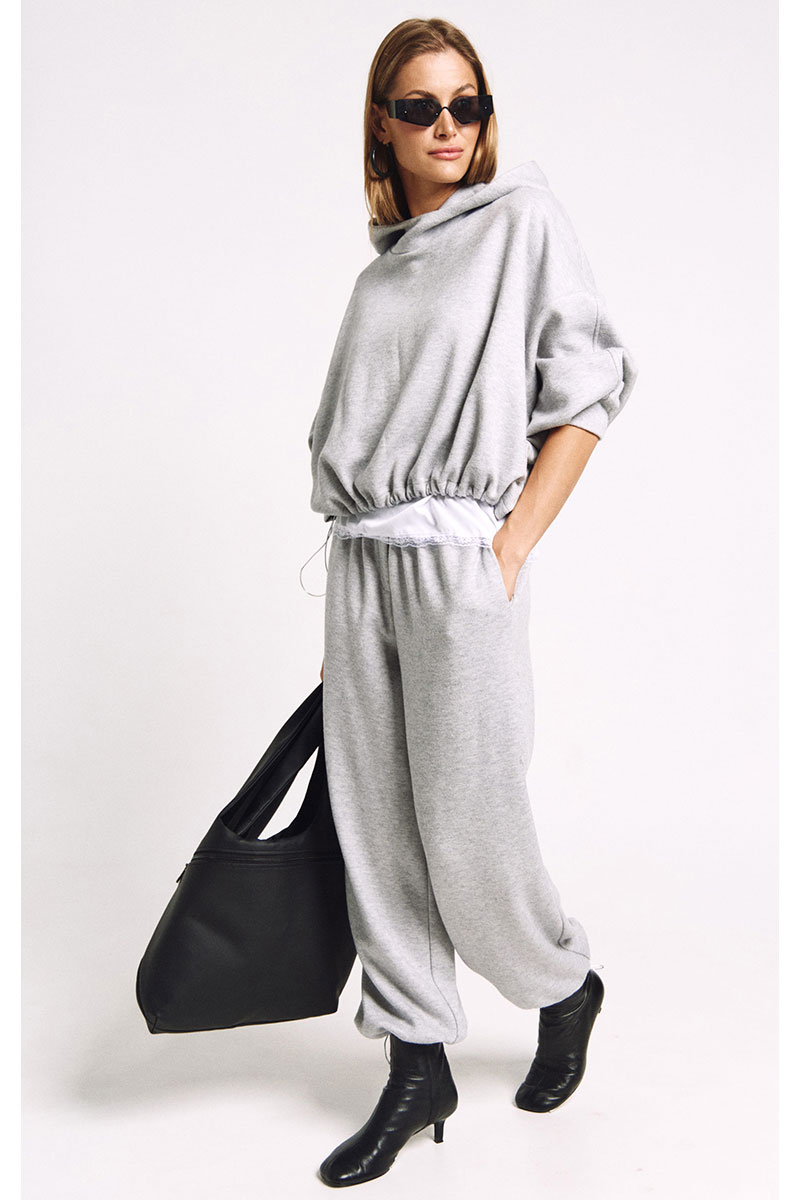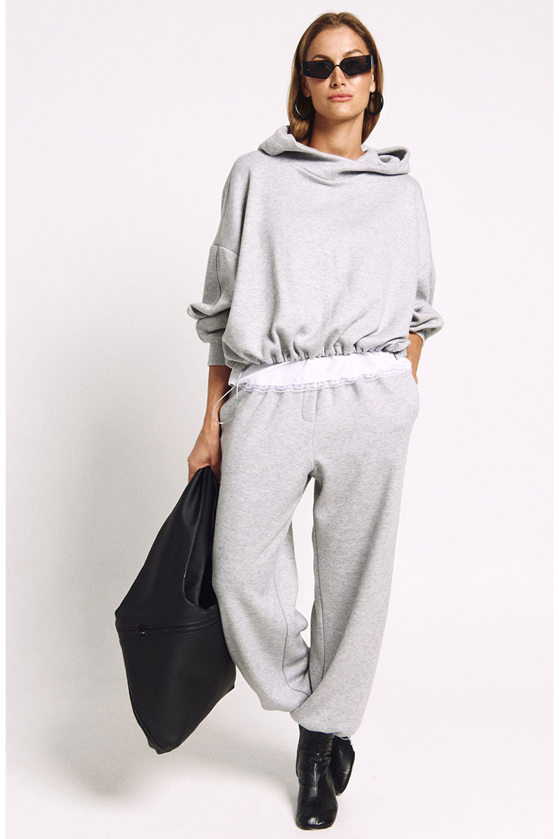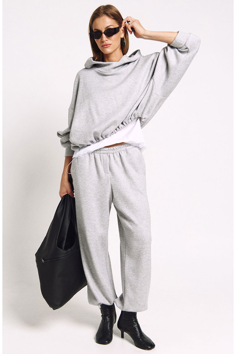 Джоггеры из мягкого трикотажа, в классическом сером. Джоггеры умеренного объема. По низу ширина регулируется металлизированной резинкой и фиксаторами.