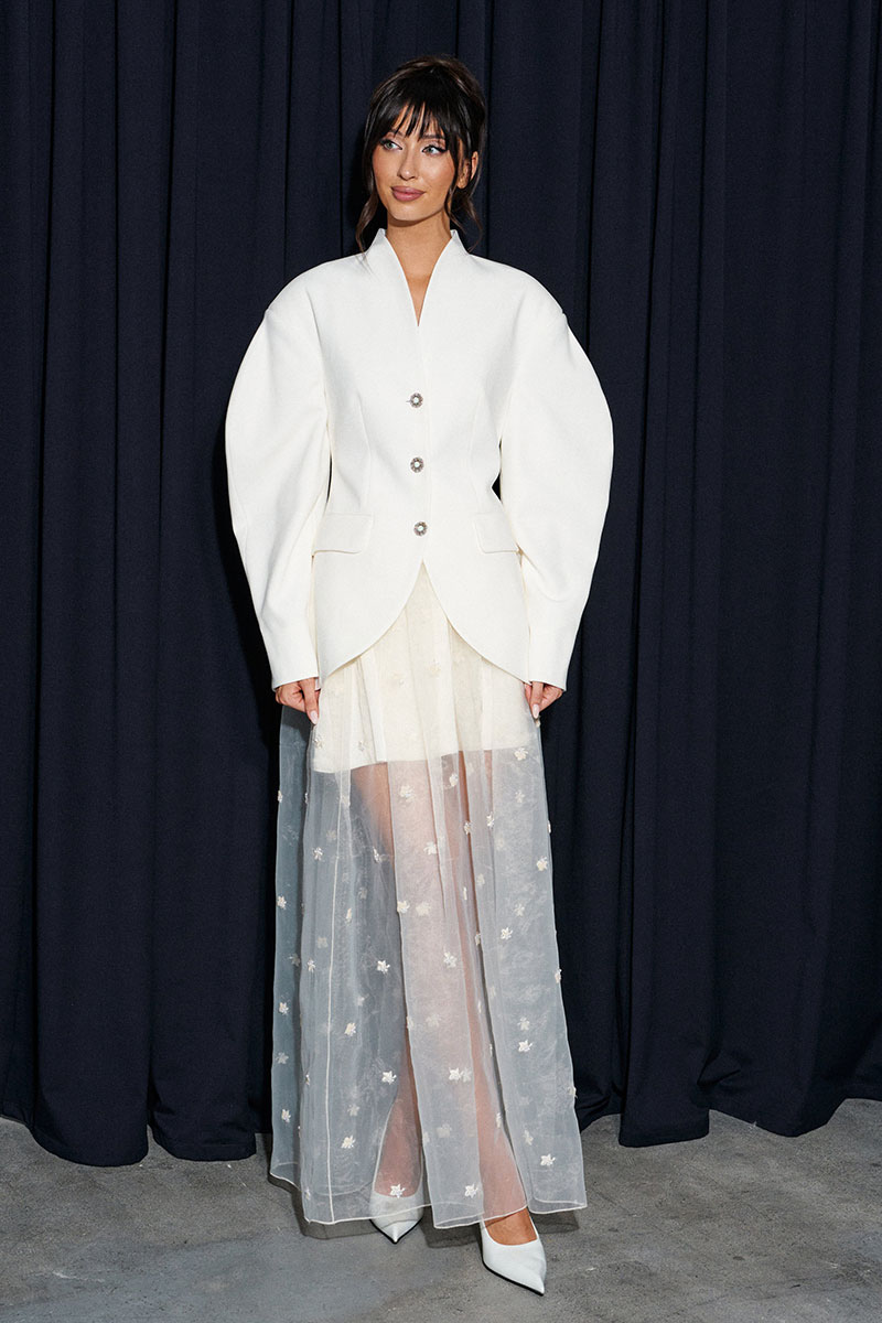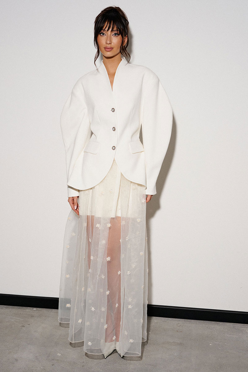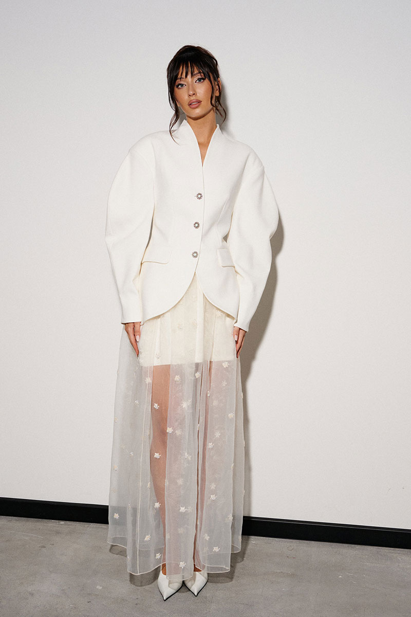 Юбка кроя полусолнце, выполнена из прозрачной ткани молочного оттенка с декоративной вышивкой.Характеристики: крой полусолнце, подкладка юбочка, пояс на резинке со сборкой.