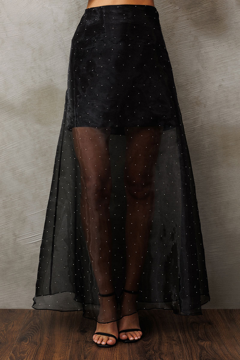 Юбка А-образного силуэта, длинная с застежкой на потайную тесьму-молнию в боковом шве. Верхняя юбка из органзы со стразами, нижняя короткая юбка из костюмной ткани. Верх юбки на обтачке.