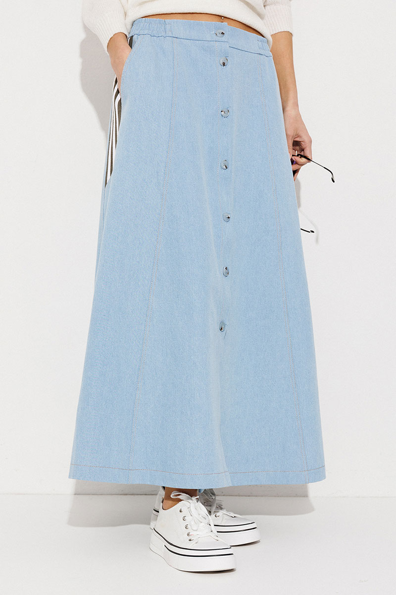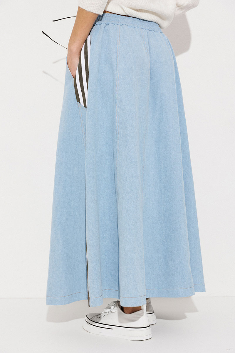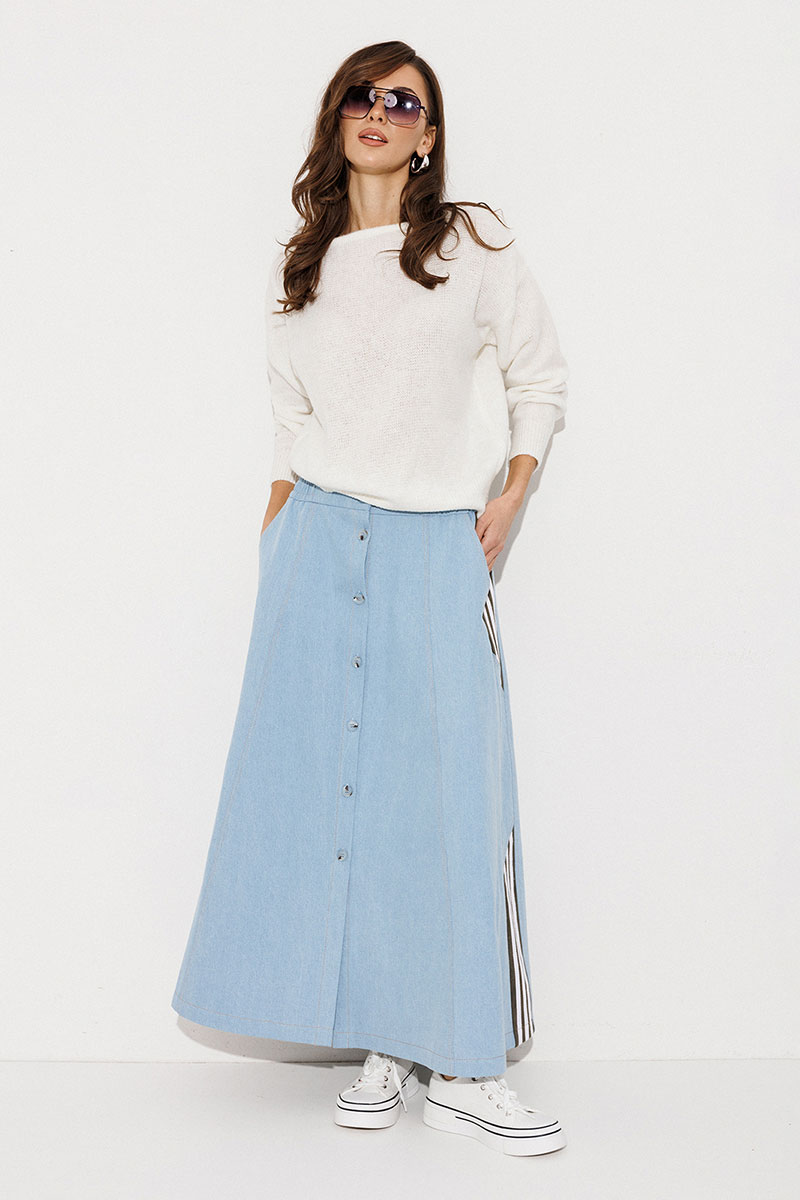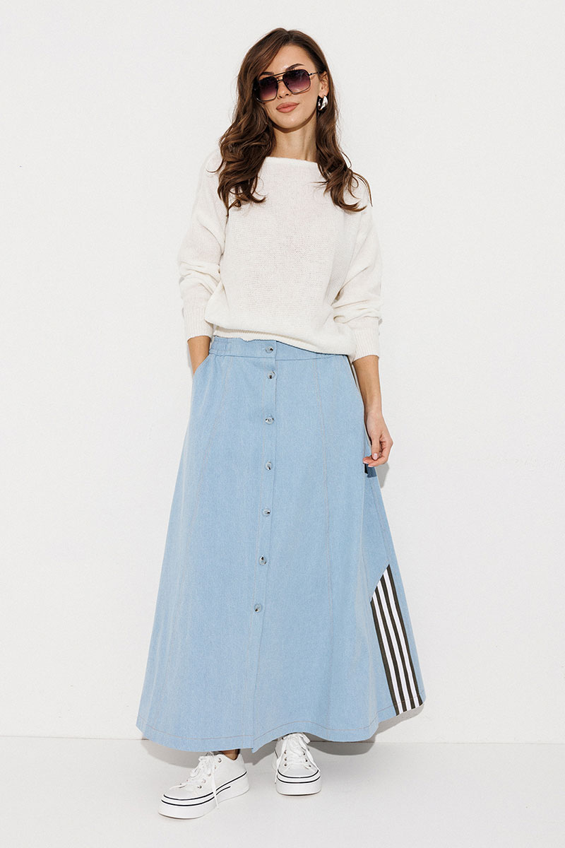 Юбка длинная комбинированная, А-силуэта на притачном отсроченном поясе на резинке с застежкой на петлю-пуговицу. Перед и спинка выполнены из джинса. По переду центральная застежка на петли-пуговицы, рельефы и карманы в шве с наклонным входом. Спинка с центральным швом и рельефами. По бокам отрезной бочок, комбинированный из замшевой отделочной ткани, по которой отстрочено 3 узких лампаса и центральная вставка из джинса.