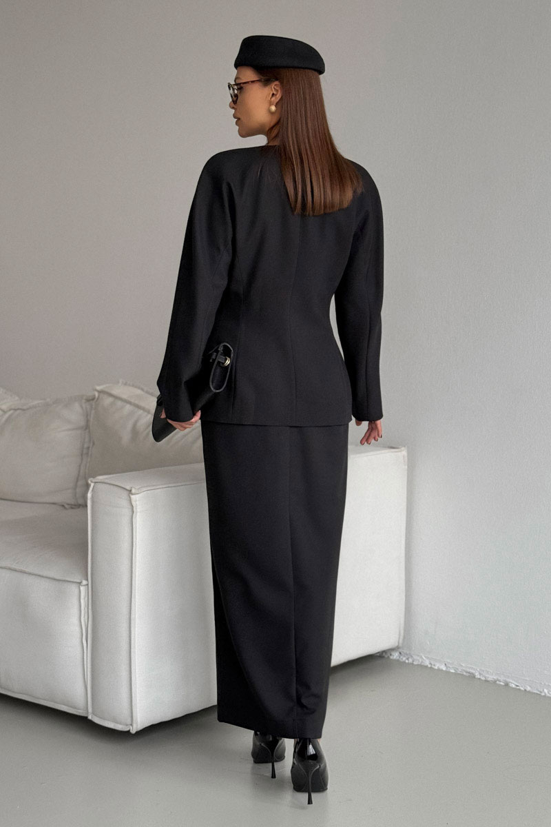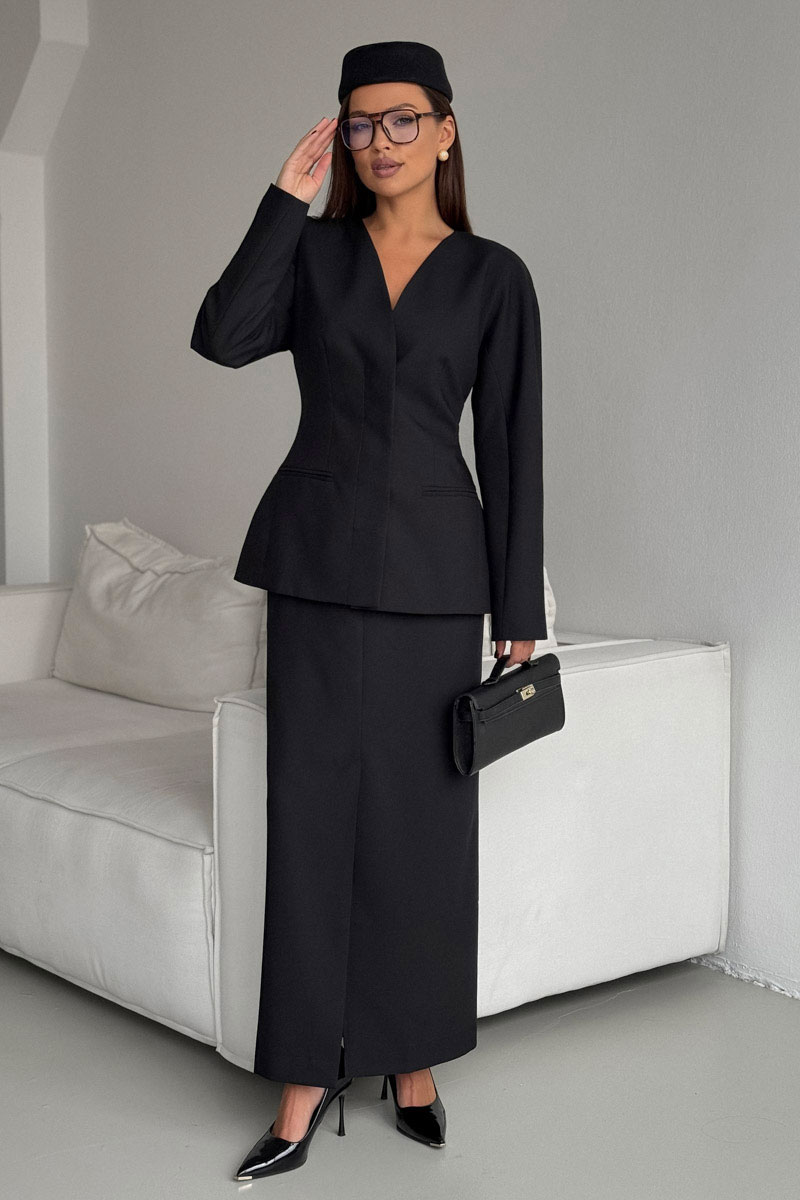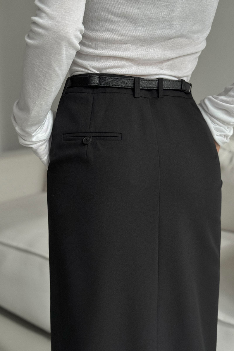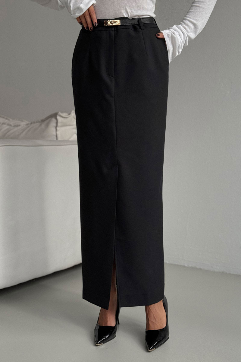 Юбка женская, прямого силуэта, спереди шлица и боковые карманы. Верх юбки обработан подкройным поясом. Спереди застежка в виде молнии, сзади функиональный карман в рамку.