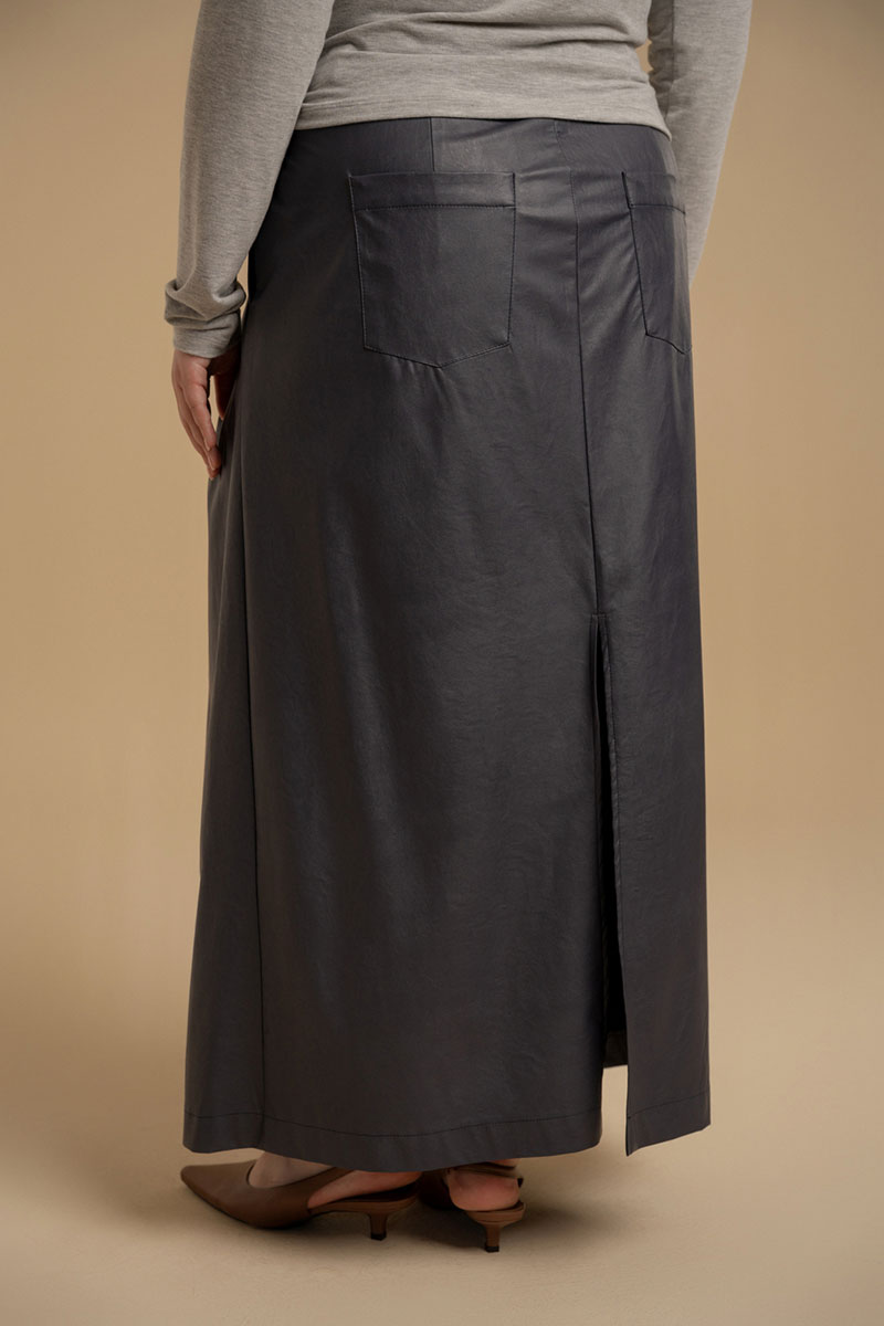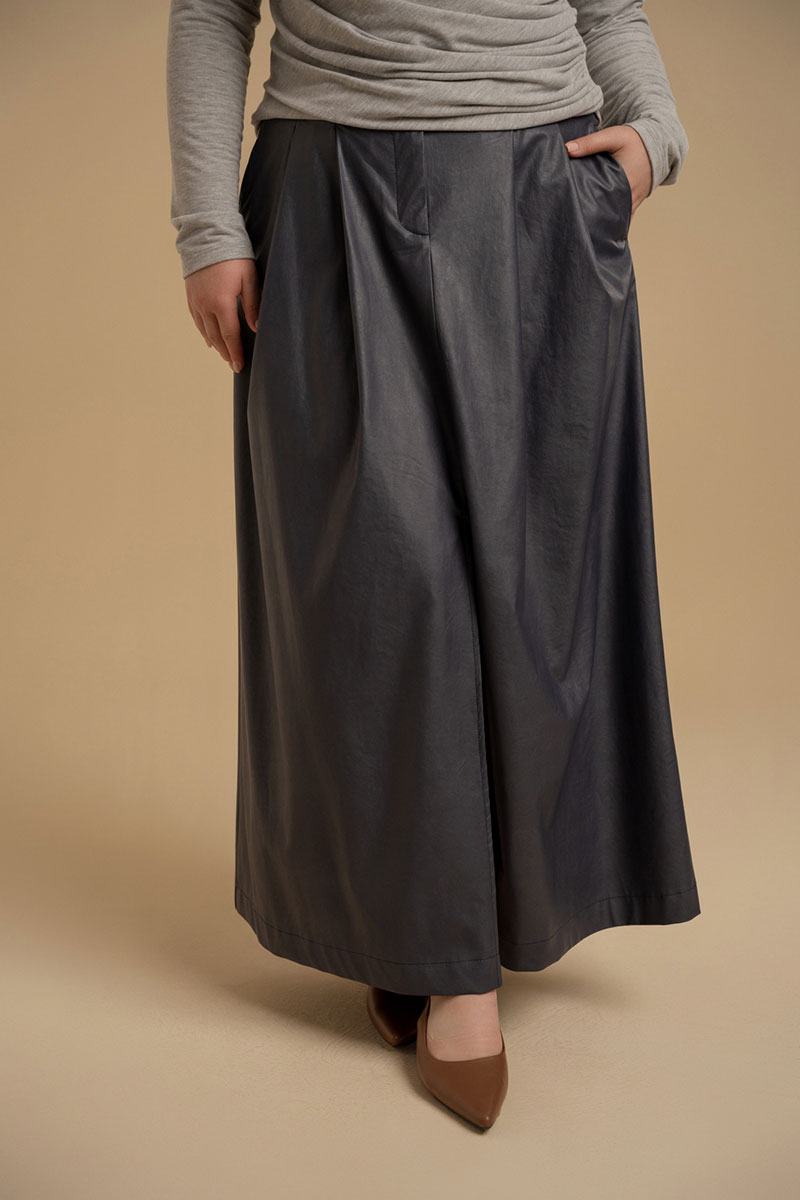 Юбка женская свободного силуэта из искусственной кожи на хлопковой подкладке. Пояс - отрезной с эластичной тесьмой. В боковых швах имеются карманы. Спереди выполнены мягкие складки. В средних швах спинки и переда - разрезы. Юбка посажена на подкладку. Есть шлевки для ремня.