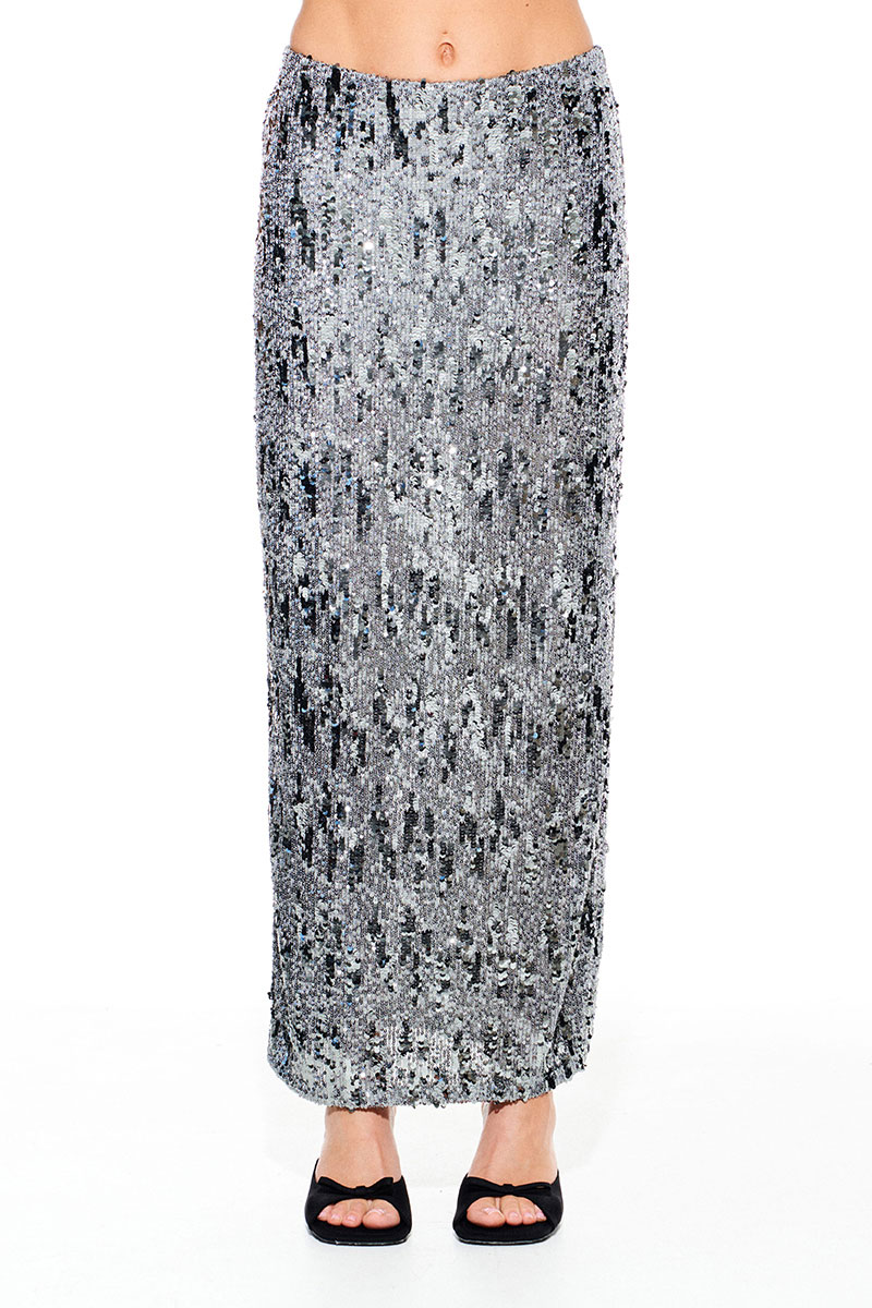 Юбка из трикотажного полотна в пайетки с притачными шортами, прямого силуэта, с разрезом в левом боковом шве. Перед и спинка цельные. Пояс на резинке. Длина юбки до щиколотки. Шорты выполнены из трикотажной подкладки.