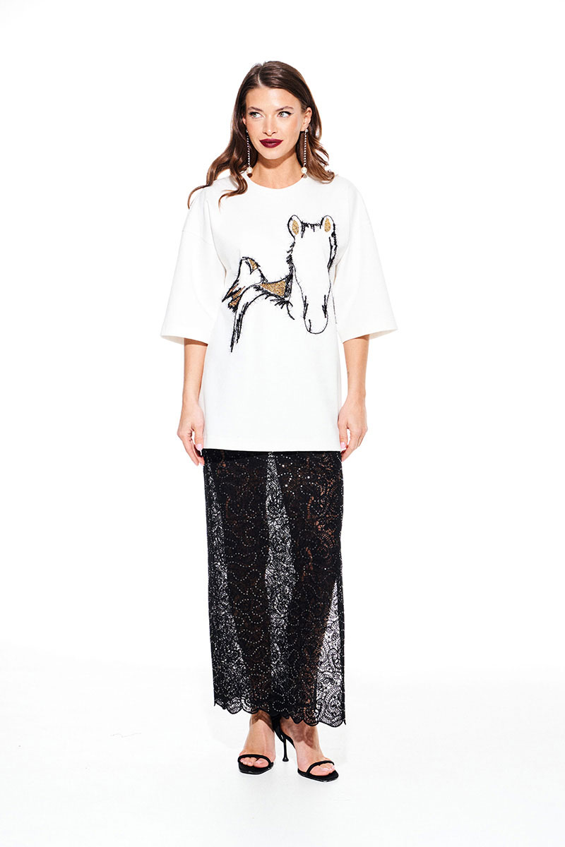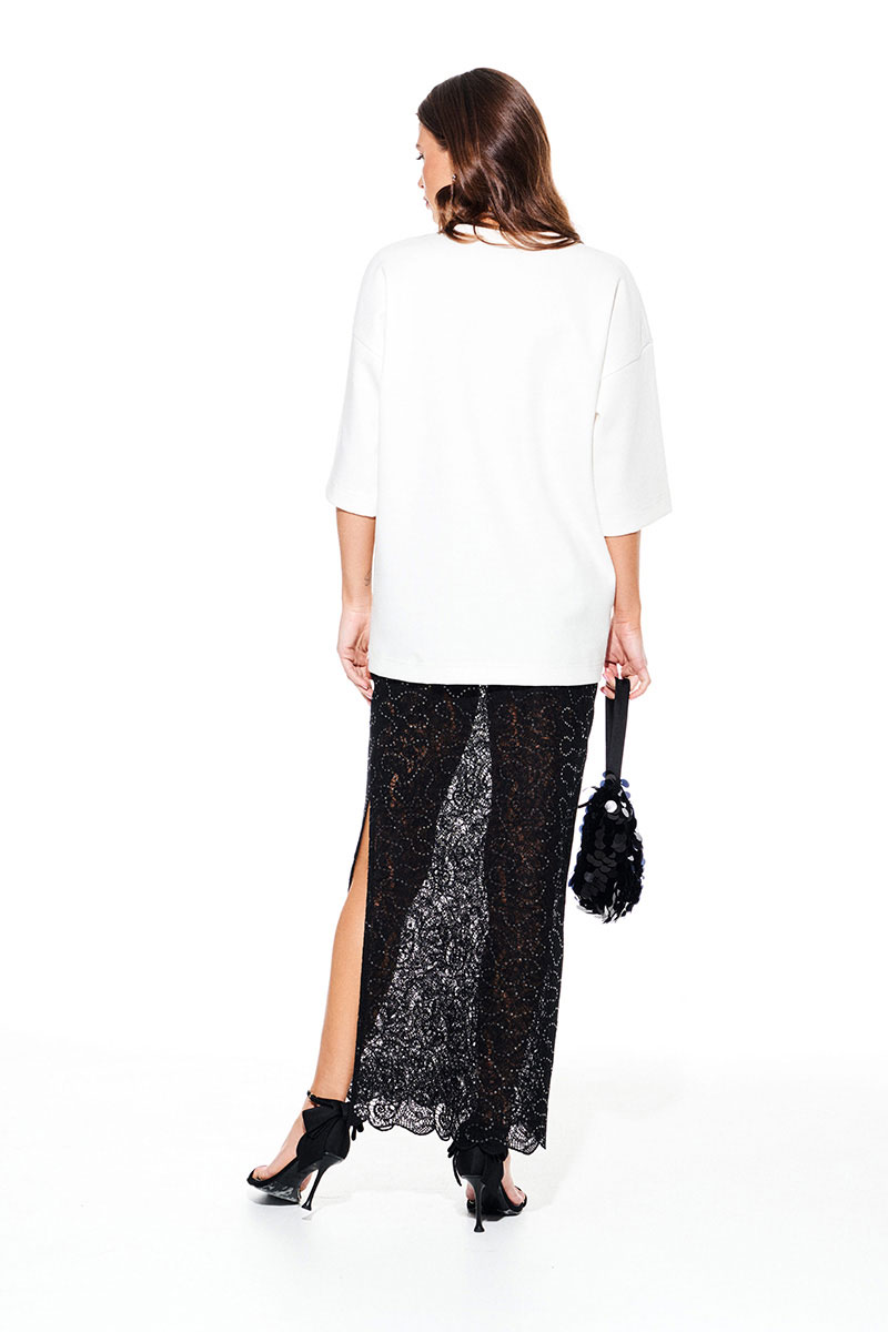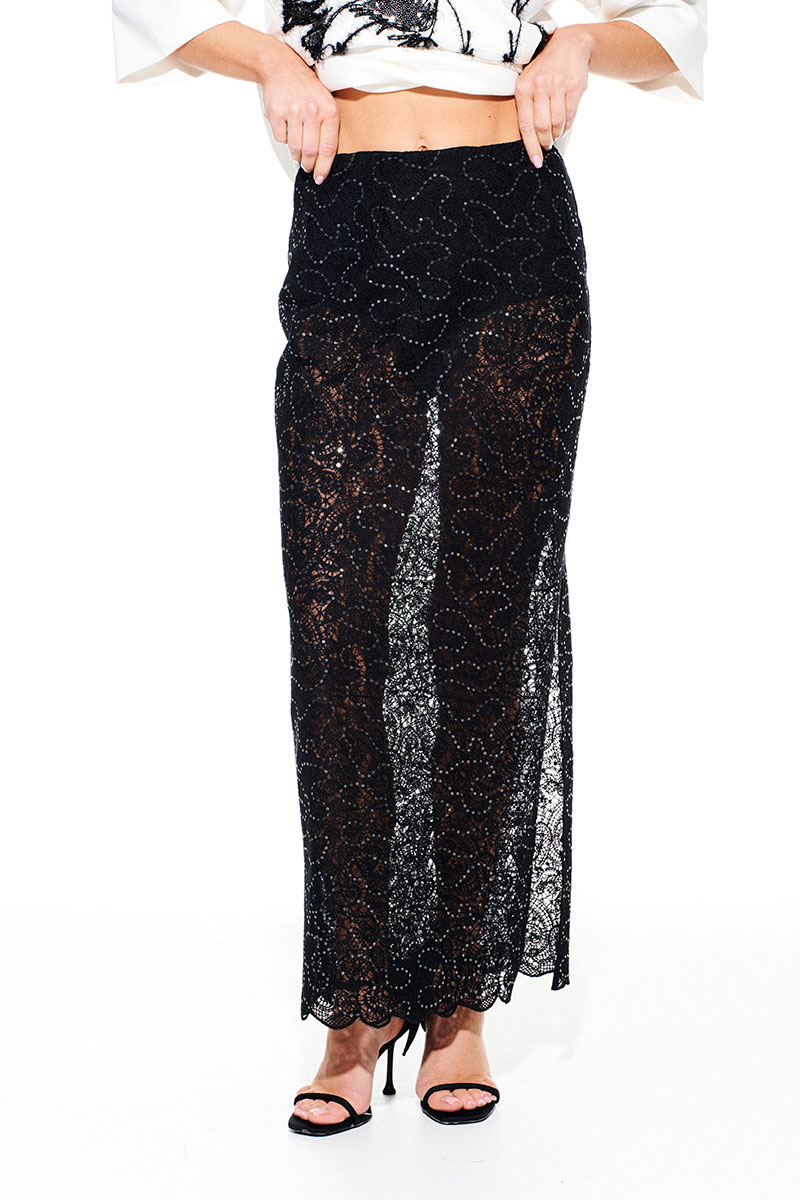 Юбка из трикотажного кружевного полотна в пайетки с притачными шортами, прямого силуэта, с разрезом в левом боковом шве. Пояс на резинке. Длина юбки до щиколотки. Шорты выполнены из трикотажной подкладки.