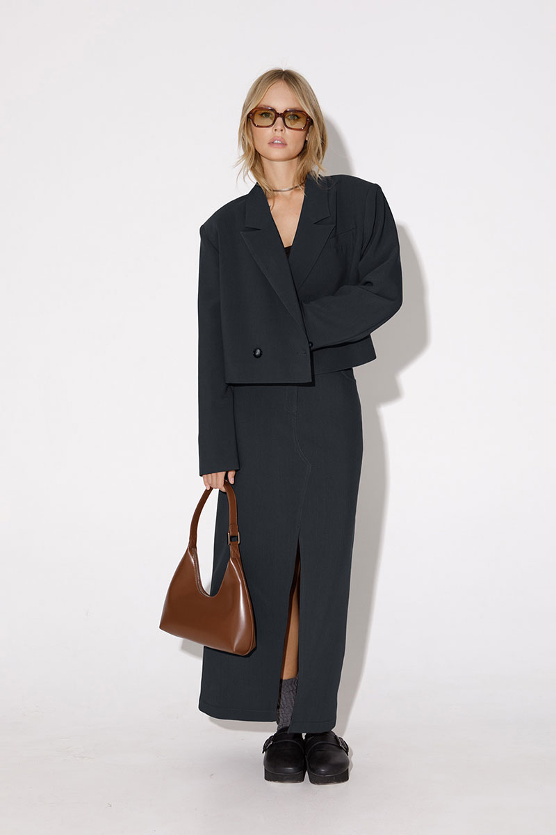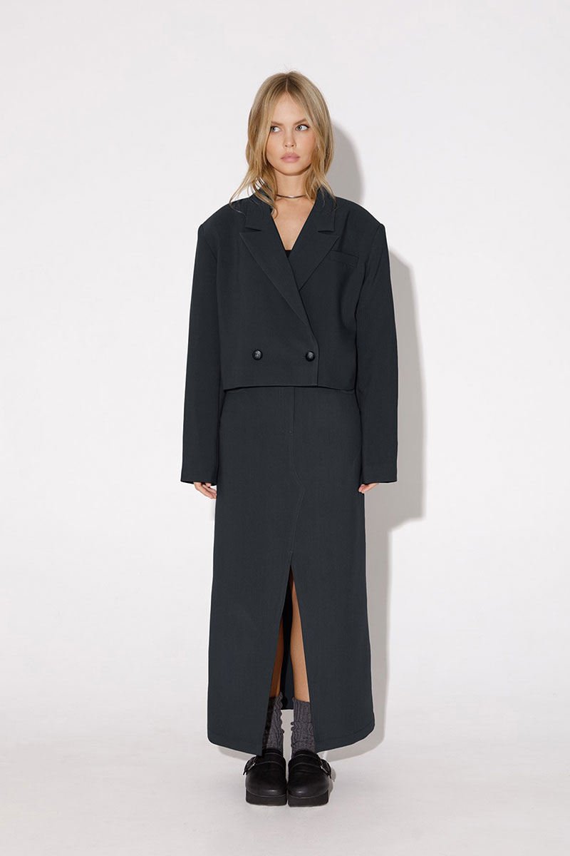 Асимметричная миди-юбка с разрезом. Детали: юбка асимметричного кроя с высоким разрезом по переду, притачной пояс со шлевками, застежка на молнию и пуговицу, боковые карманы.
