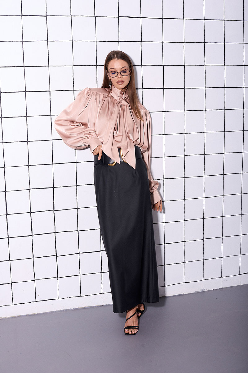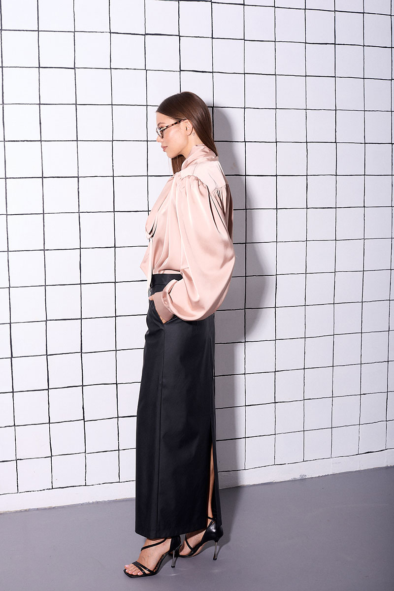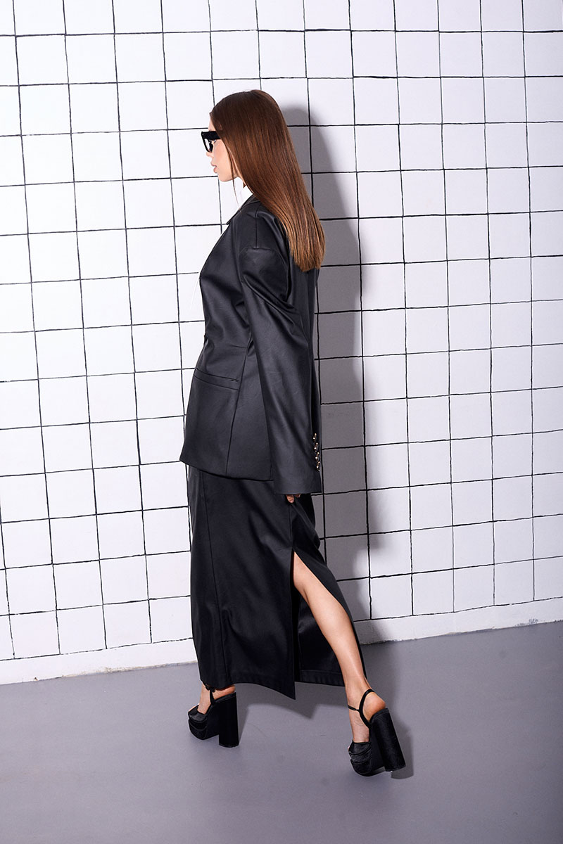 Юбка-макси изготовлена из искусственной кожи, на подкладке. На заднем полотнище, расположен разрез и потайная застежка на молнию.