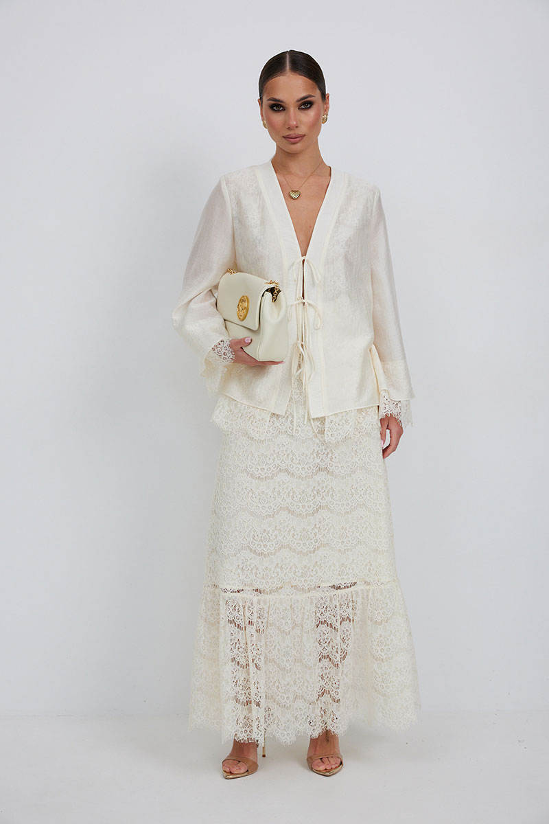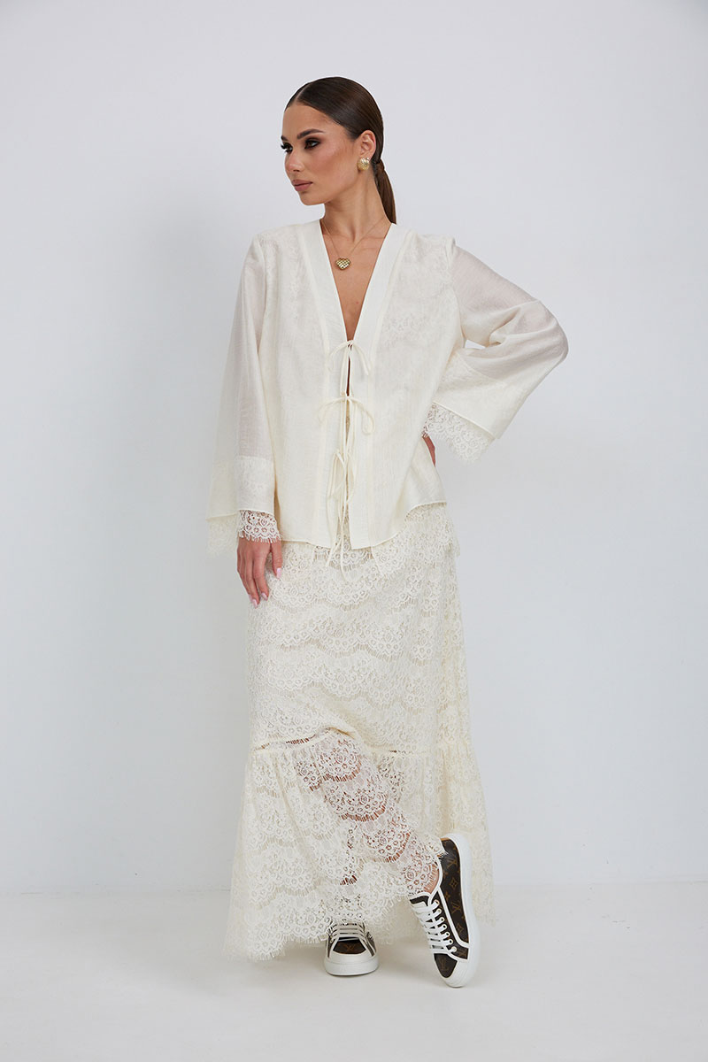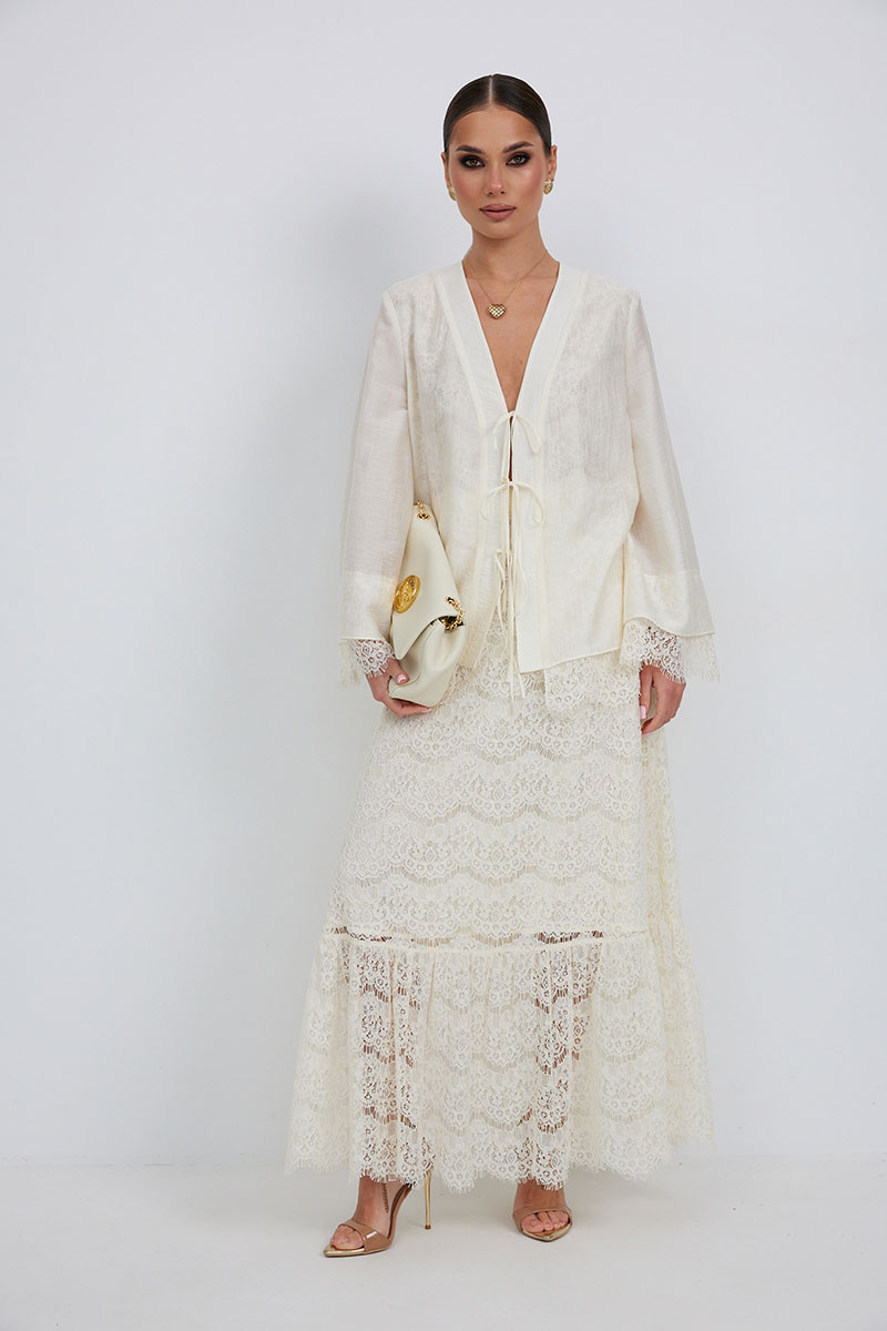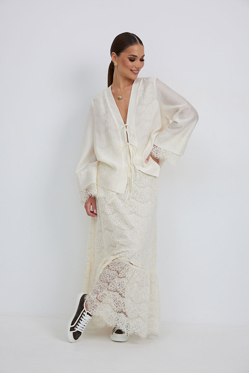 Юбка женская из кружевной ткани, имеет А-образный расширенный силуэт, с широким воланом со сборкой по низу, длина макси, юбка на подкладке. Верх юбки на поясе, со шлевками под ремень, застежка на потайную молнию по среднему шву сзади.