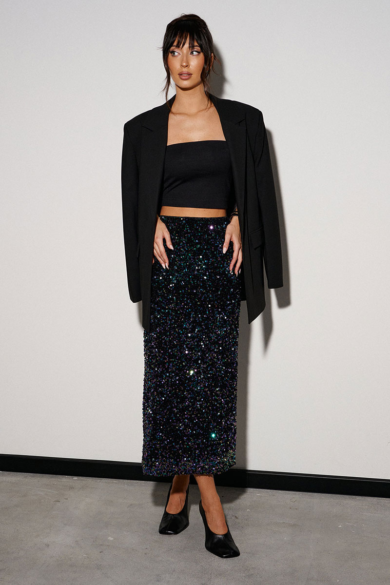 Юбка прямого кроя выполнена из полотна с пайетками. Характеристики: прямой крой, подкладка, пояс на резинке.