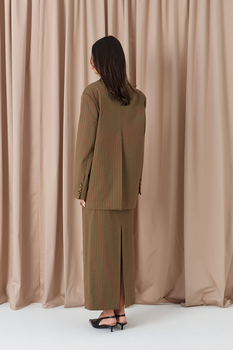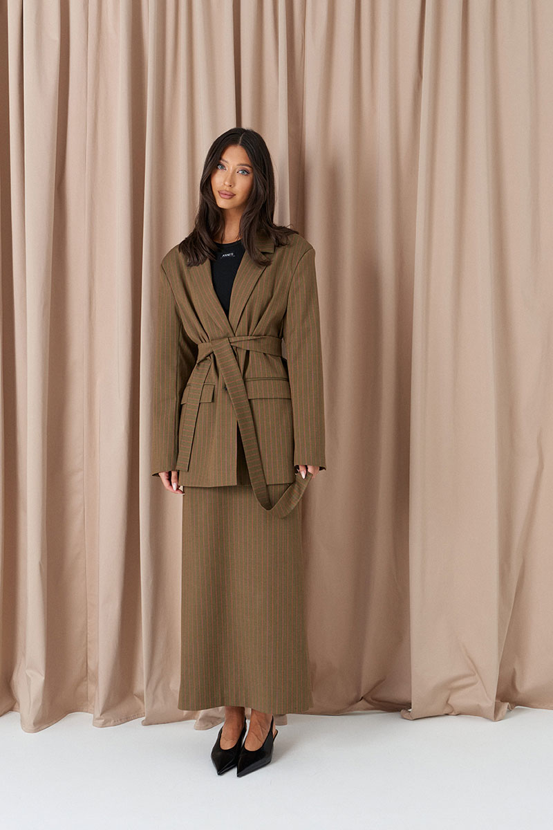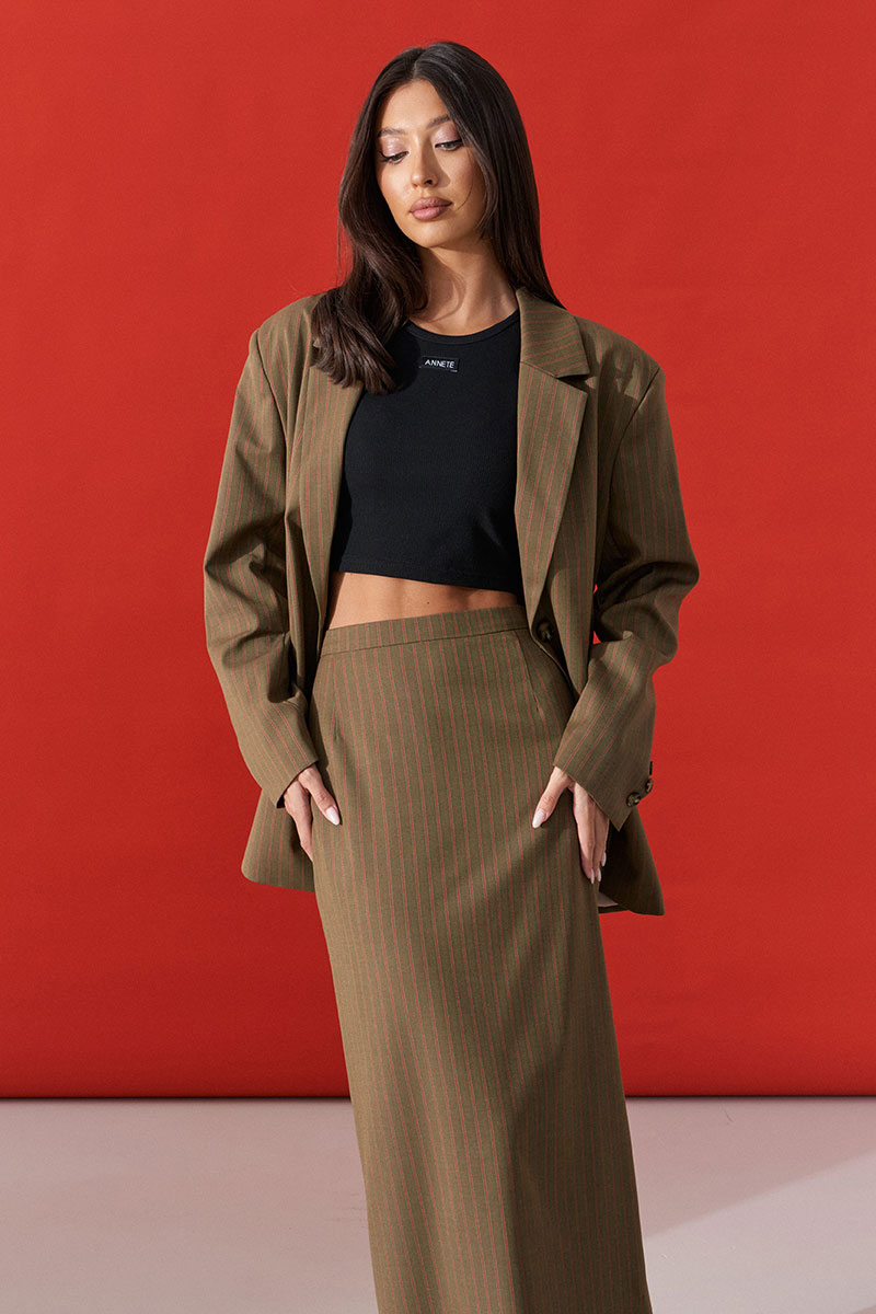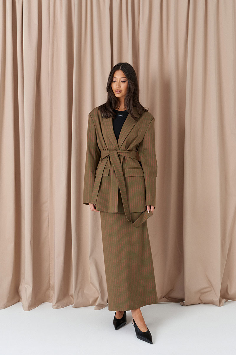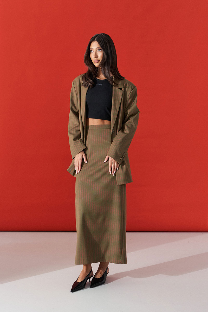 Юбка прямого кроя. Выполнена из костюмной ткани цвета хаки с оранжевой полоской. С подкладкой. Пояс стабильный. В среднем шве заднего полотна разрез (49 см). Застёжка молния в среднем шве заднего полотна.