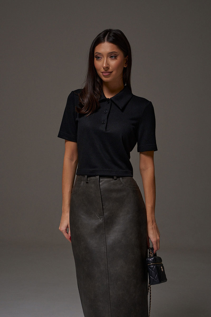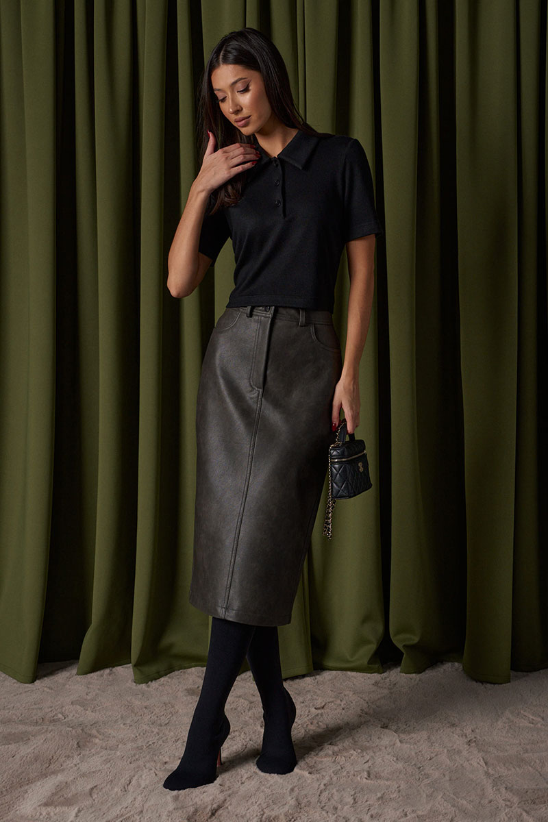 Юбка прямого кроя выполнена из экокожи. Характеристики: прямой крой, пояс стабильный со шлевками, на брендированной подкладке, застёжка центральная пуговица, молния, по передней части изделия прорезные карманы, по заднему полотну накладные карманы. В среднем шве разрез 32 см.