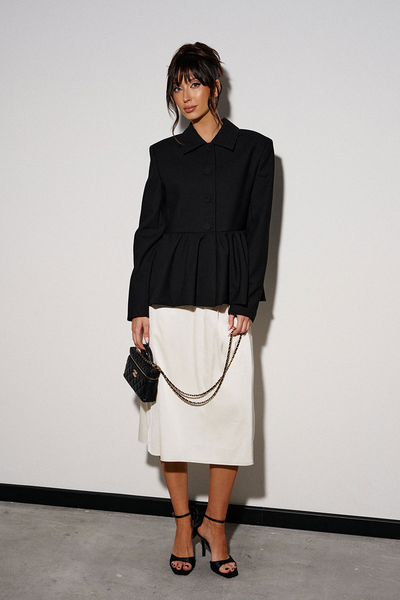 Юбка полуприлегающего силуэта выполнена из струящегося полотна молочного цвета на подкладке. Характеристики: полуприлегающий силуэт, пояс на резинке.