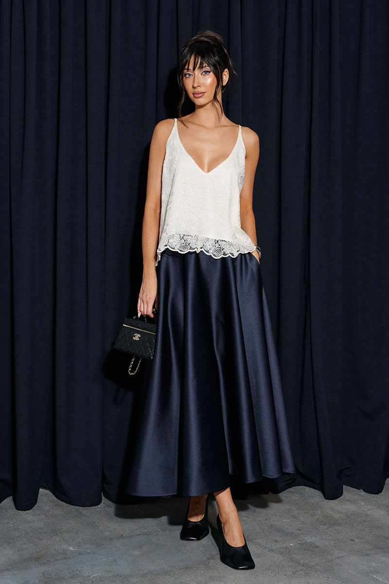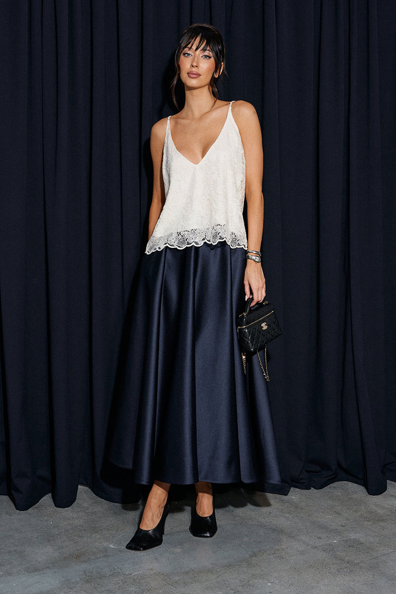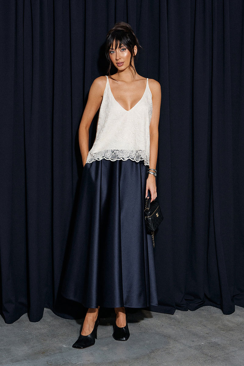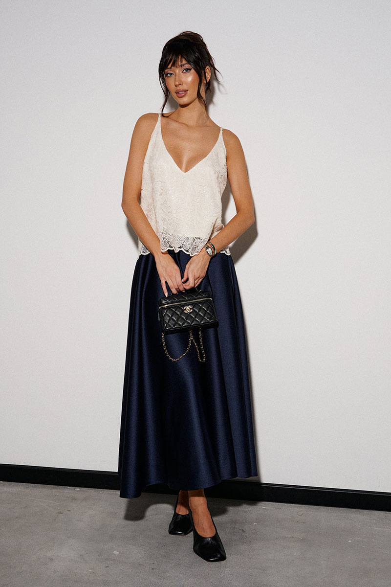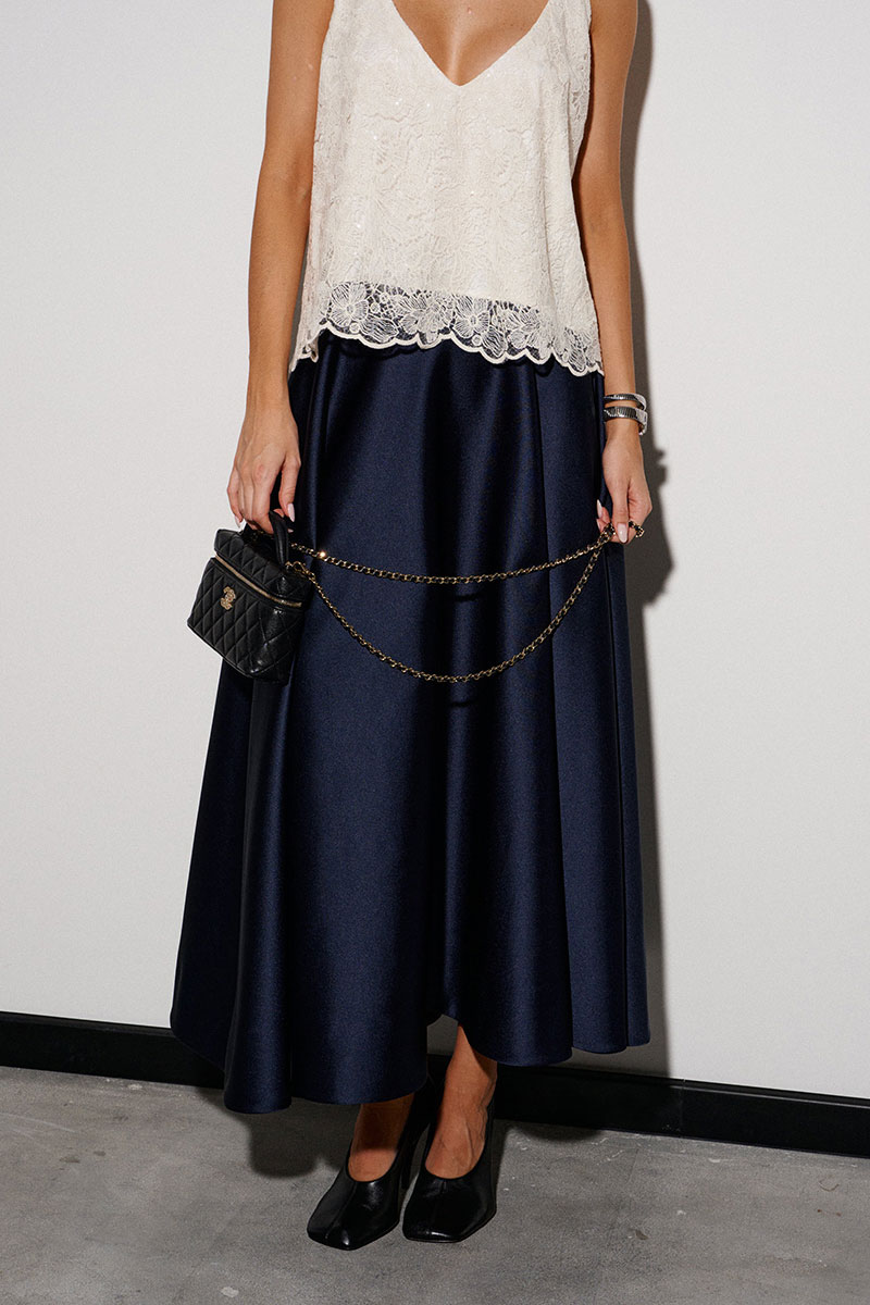Юбка свободного кроя выполнена из плотного полотна темно - синего цвета. Характеристики: крой солнце, брендированная подкладка, пояс притачной стабильный, застежка потайная тесьма молния в среднем шве заднего полотна изделия, в боковых шва карманы. Длина 89 см.