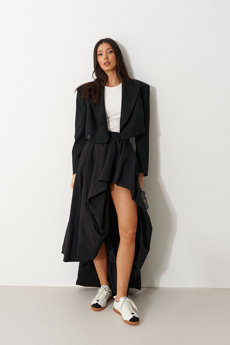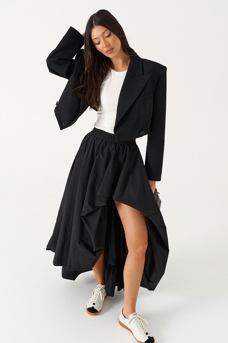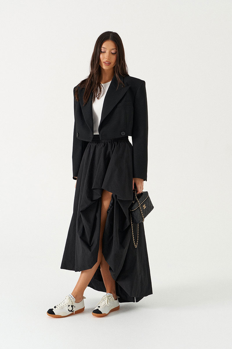 Юбка женская с фигурным низом, выполнена из полотна черного цвета. Характеристика: фигурный низ с глубоким вырезом на левом бедре, пояс на резинке, на подкладке, низ юбки на мягком подгибе.