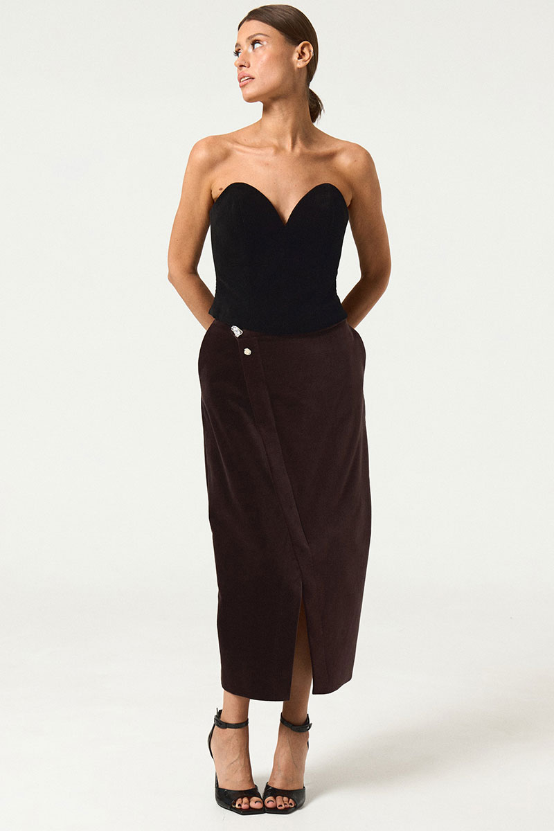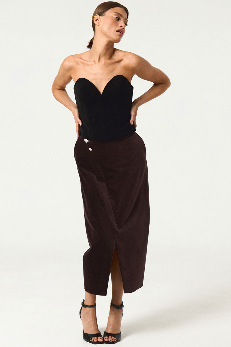 Юбка из ткани с эффектом бархата. По левой стороне юбки разрез, юбка на запах, декорирована тремя декоративными пуговицами. Юбка на поясе. В запахе изделия пзастежка на молнию.