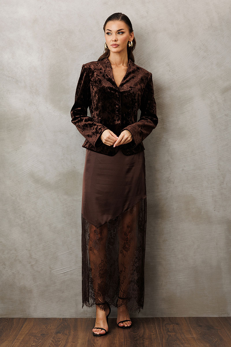 Юбка прямого силуэта из атласа и кружева. Юбка на обтачке. По переднему и заднему полотнищам юбки - вытачки. Юбка с застежкой в боковом шве на потайную тесьму-молнию. Верхняя часть юбки из атласа с асимметричный краем, нижняя часть юбки из кружева с ажурным низом. Юбка без подкладки.