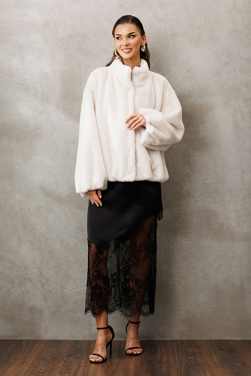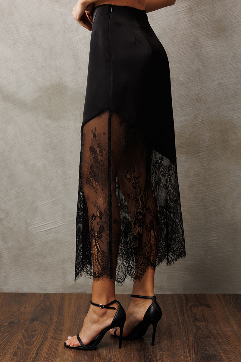 Юбка прямого силуэта из атласа и кружева. Юбка на обтачке. По переднему и заднему полотнищам юбки - вытачки. Юбка с застежкой в боковом шве на потайную тесьму-молнию. Верхняя часть юбки из атласа с асимметричный краем, нижняя часть юбки из кружева с ажурным низом. Юбка без подкладки.