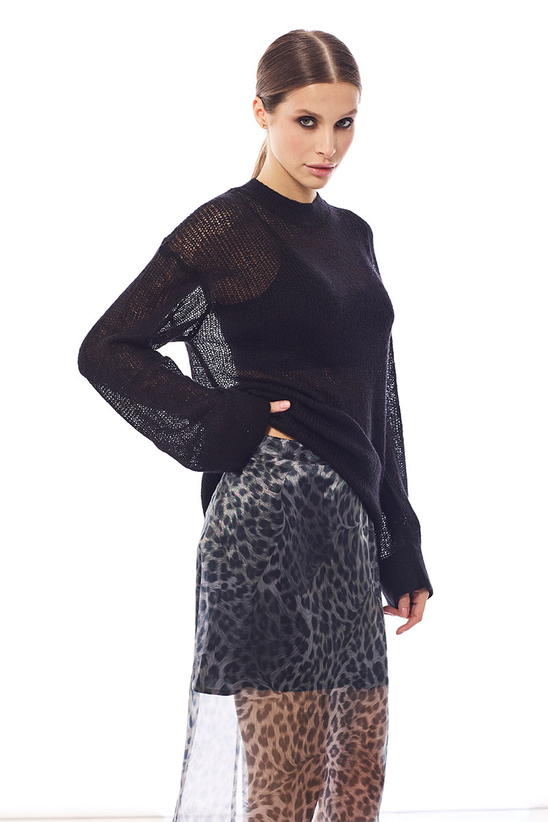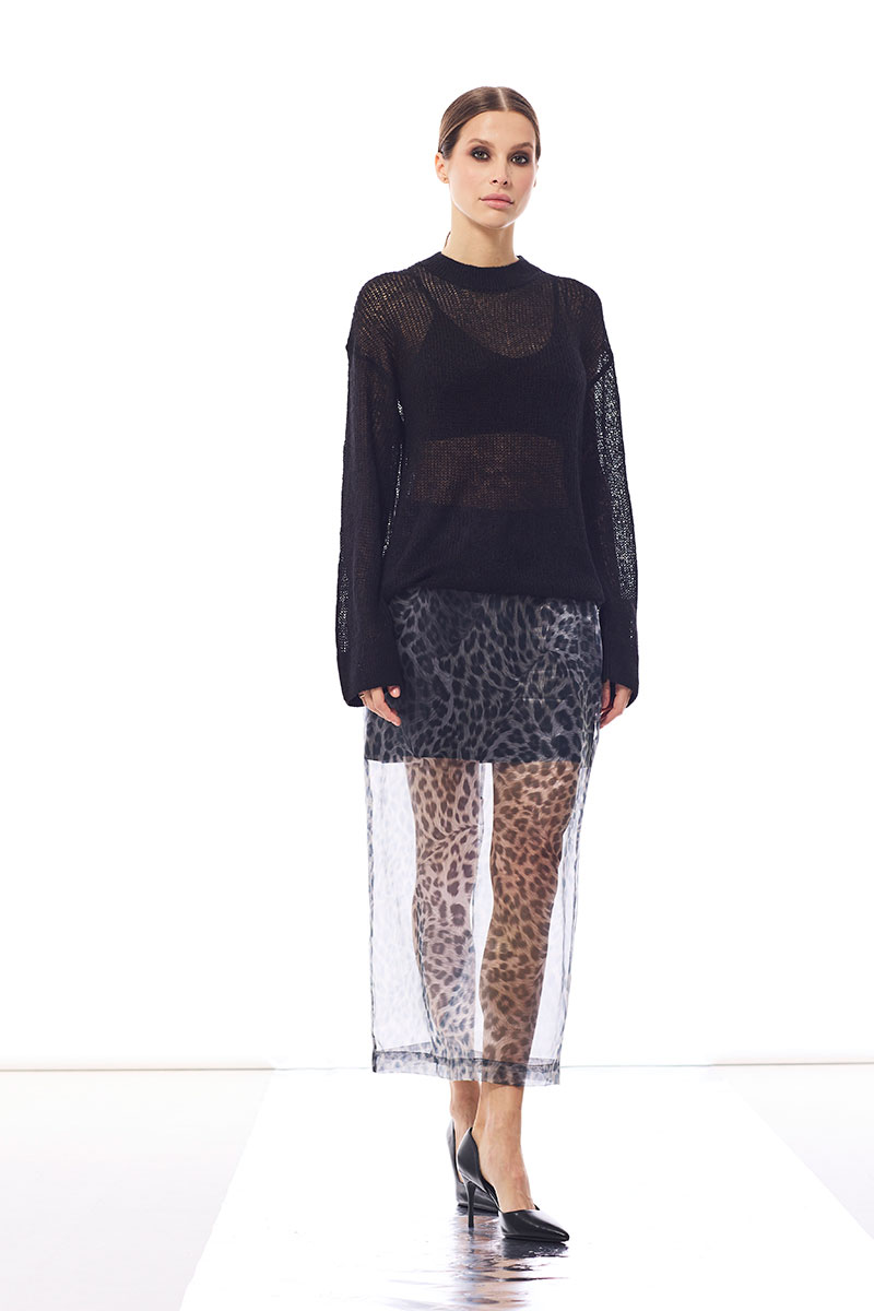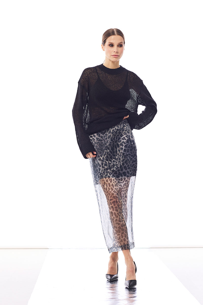 Юбка прямого силуэта выполнена из принтованной органзы. Юбка на трикотажной подкладке, по спинке разрез. Верх юбки обработан притачным поясом, застежка на потайную молнию.