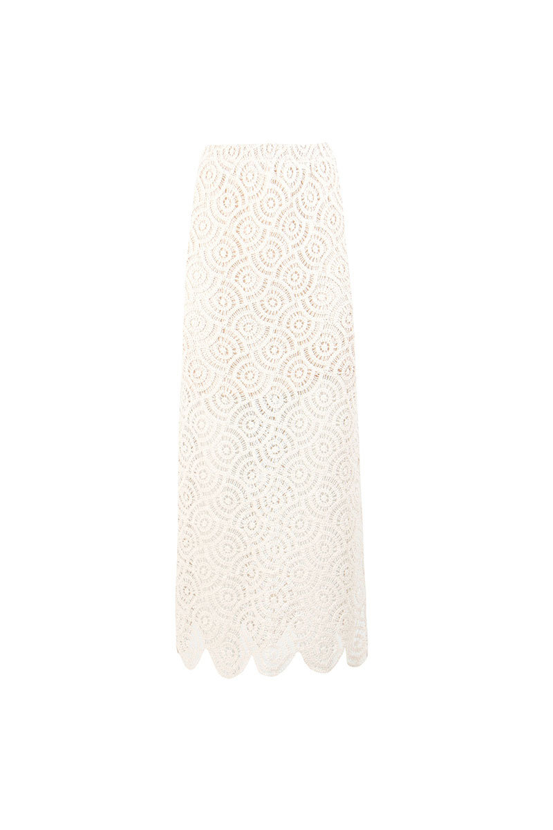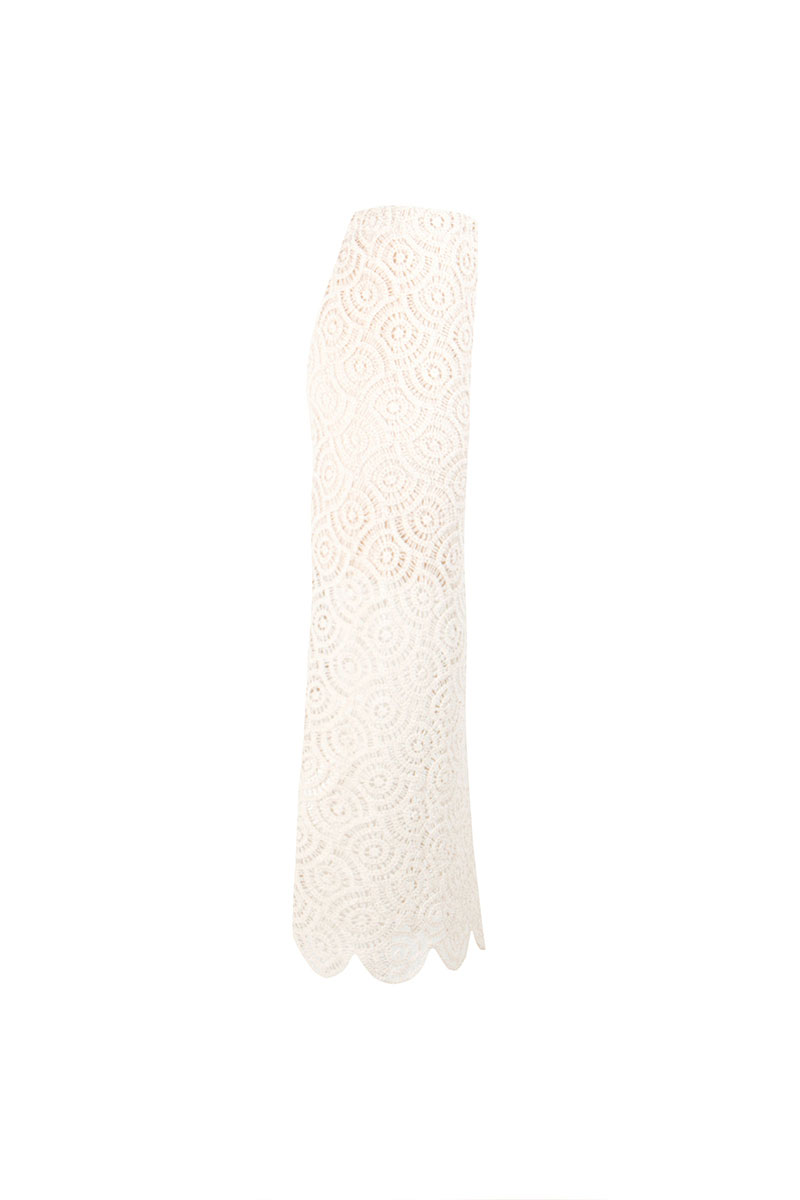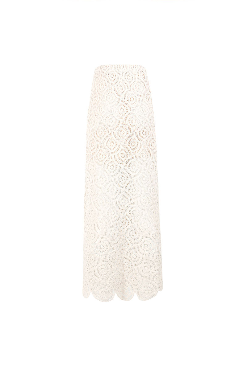 Юбка женская прямая, на подкладке, длинная из кружевного трикотажного полотна. В нижней части левого бокового шва разрез. Пояс на резинке.